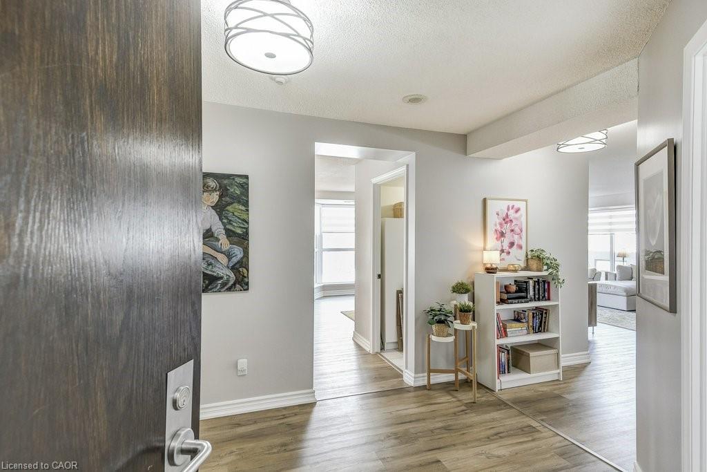 Luxury living meets modern style in this beautifully updated 2-bedroom, 2-bath suite at Bentley Place in the heart of the Durand neighbourhood. This expansive 1500+ sqft corner unit offers a bright, open-concept layout filled with natural light and city views through newly installed windows (2025). The modern white kitchen is a standout feature, showcasing gorgeous Statuario quartz countertops, stainless steel appliances and plenty of cabinetry for the aspiring chef. The spacious dining and living areas have amazing appeal whether it be for entertaining or relaxing. Two large enclosed balconies extend the living space — one off the living room (open and closed) and one private to the primary bedroom — offering an option to enjoy the skyline views year-round, rain or shine. The primary suite includes a spa-inspired 5-piece ensuite with a jetted tub and a generous walk-in closet with closet organizers. The second bedroom is equally spacious, also featuring a walk-in closet and custom storage solutions. Thoughtfully updated throughout with modern flooring, fresh paint and fashionable zebra blinds, every detail reflects care and contemporary taste. Residents of Bentley Place enjoy exclusive amenities including an exercise room, media room and underground parking. Highly walkable location! This wonderful spot will appeal to you if you enjoy walking, cycling or utilize public transit. Convenient proximity to McMaster Hospital/University. Surrounded by the arts, culture, recreation of downtown Hamilton. You will be within walking distance to James Street North, Hess Village, the Farmer’s Market, First Ontario Concert Hall, the Art Gallery of Hamilton, Locke Street, parks, a wide variety of cuisine, fine dining, shopping, West Harbour GO and scenic escarpment trails. One of the building’s larger units, this move-in-ready suite delivers the sophistication, space, and lifestyle you’ve been waiting for.