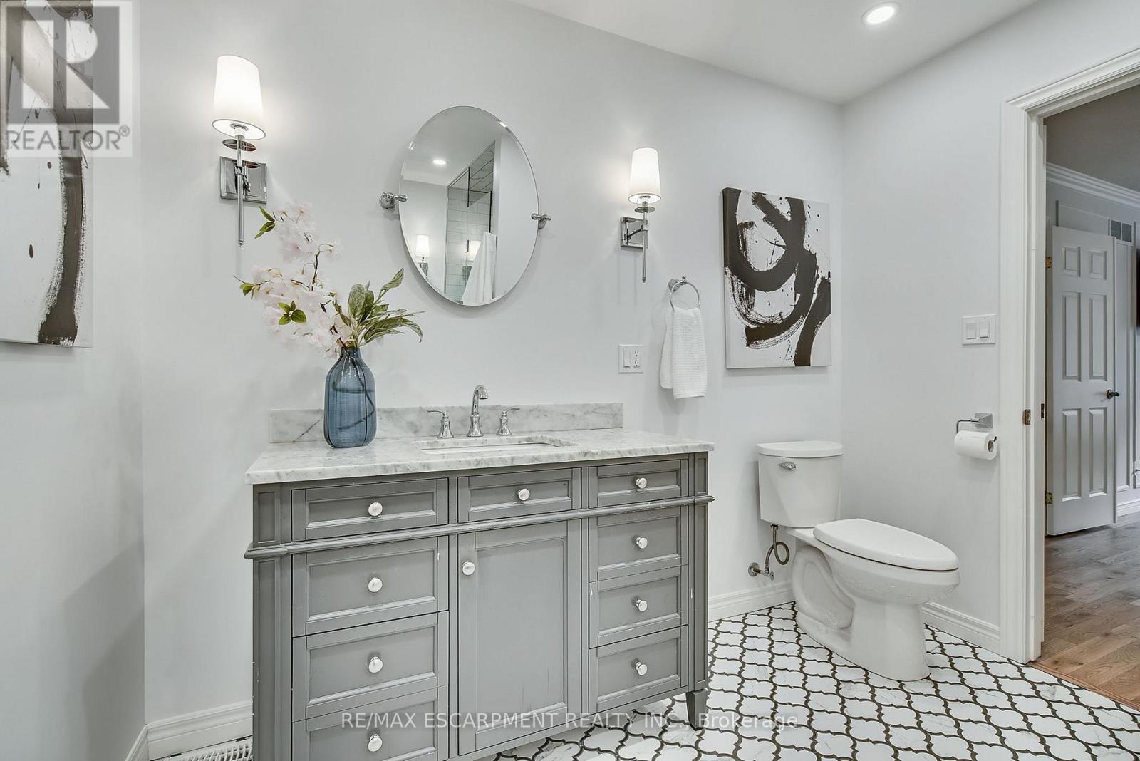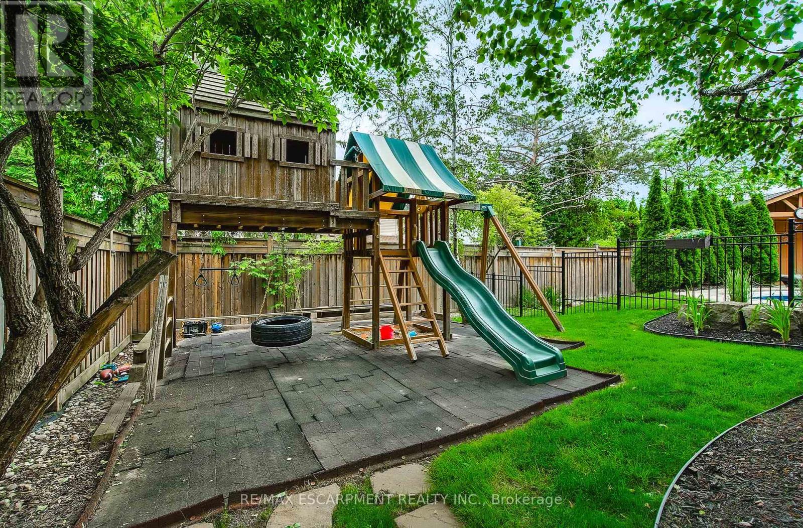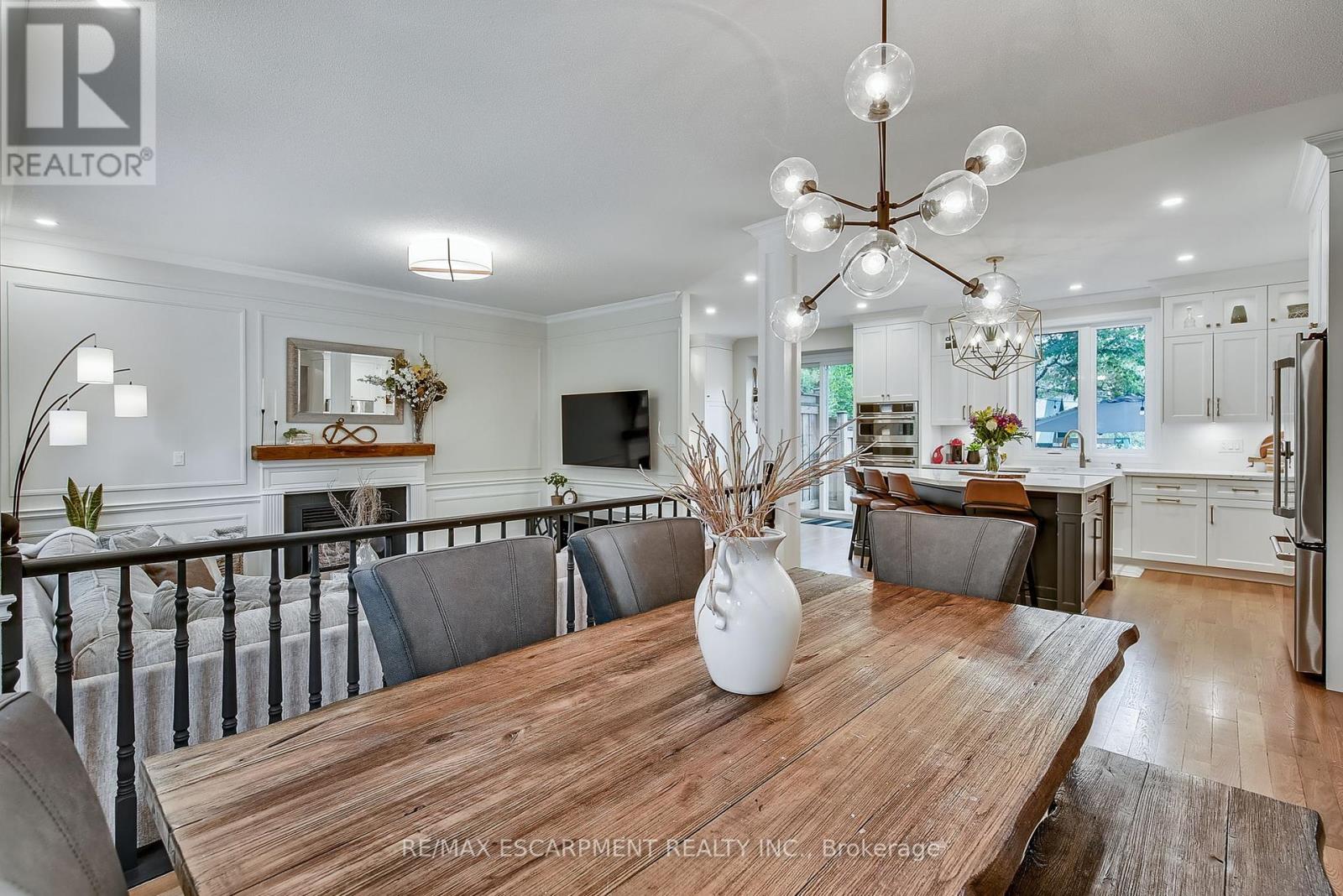 Prestige, Luxury, and Lifestyle in Ancaster's Most Coveted Enclave. Set in one of Ancaster's most sought-after neighbourhoods - just steps from the iconic Hamilton Golf & Country Club - this freshly reimagined residence offers nearly 4,000 sq. ft. of refined living space where timeless design meets everyday comfort.The professionally designed chefs kitchen ('22) is the showpiece of the home: custom full-height shaker cabinetry with glass-lit accents, quartz counters, a charcoal island with brushed bronze fixtures, gas cooktop with pot filler, farmhouse sink, custom range hood, and herringbone style backsplash. Wide-plank hardwood floors and designer lighting complete this entertainer's dream. Main-floor highlights include a bright executive home office, elegant wainscoting, and an inviting flow that balances open concept with defined living spaces. Upstairs, four spacious bedrooms provide plenty of room to grow, while the primary suite feels like a boutique hotel retreat: Moroccan-inspired marble tile, walk-in glass shower, and dual vanities ('20). The fully finished lower level adds flexibility, with a 5th bedroom, full bath, and generous rec space - perfect for guests, in-laws, or an independent teen. Step outdoors and discover a backyard built for memory-making: a sparkling saltwater pool with a brand-new liner ('25), built-in play structure, and a fully fenced yard that offers both privacy and peace of mind. Families will appreciate proximity to top-ranked public and Catholic schools, with extracurricular programs, parks, and trails nearby - making this not just a home, but a foundation for a connected, active lifestyle. This is more than a house. It's an Ancaster lifestyle statement - design-driven, family-forward, and move-in ready in one of the city's most prestigious enclaves. (id:52316)