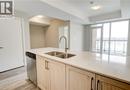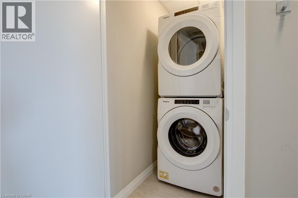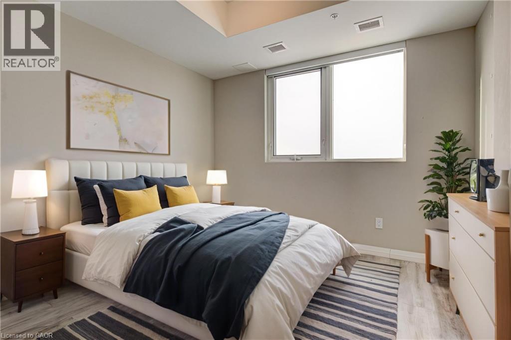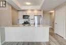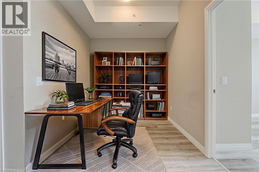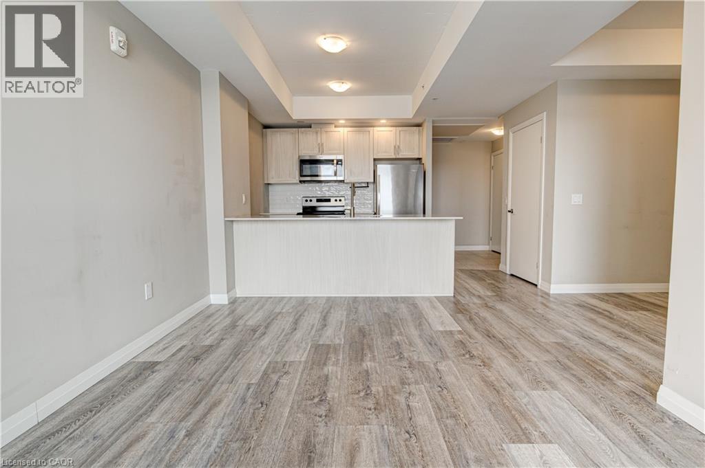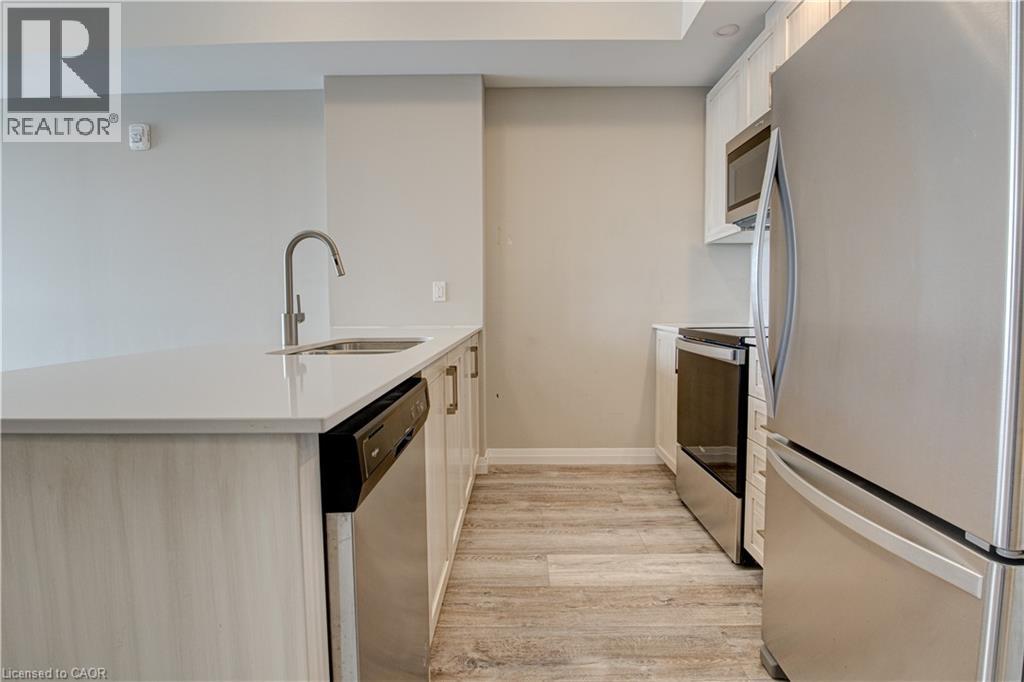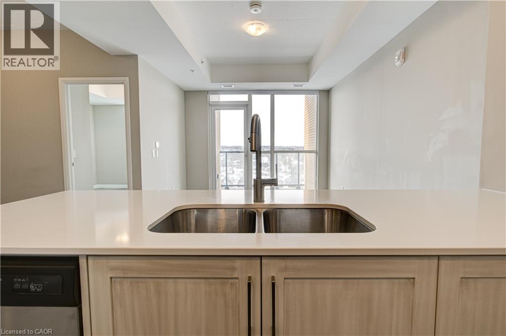 Located just steps to downtown Kitchener and the beautiful Victoria Park, this 1 bedroom plus den condo at 108 Garment Street offers a welcoming place to settle into city living. Completed in 2022, the unit features a practical layout and a kitchen that truly anchors the space. Upgraded appliances and cabinetry, a double sink, dishwasher, and generous counter space make it easy to cook at home, while the extra-long peninsula comfortably seats three to four—ideal for casual meals or hosting friends. The living area flows easily from the kitchen and opens to a private west-facing balcony, offering a quiet place to unwind in the afternoon and evening. The den adds valuable flexibility, working equally well as a home office, extra storage, or cozy reading nook. The bedroom is comfortably sized, and the unit is completed by a contemporary bathroom and the convenience of in-suite laundry. Indoor garage parking for one vehicle and a storage locker are included with the unit. Residents also enjoy access to a well-equipped fitness room, yoga space, party room, and an outdoor terrace featuring a pool, basketball court, BBQ area, and plenty of seating for gathering with friends. Ample visitor parking next door makes hosting easy. With shops, transit, dining, and the tech district just outside your door, this home offers an easy, low-maintenance lifestyle in a central location. (id:52316)