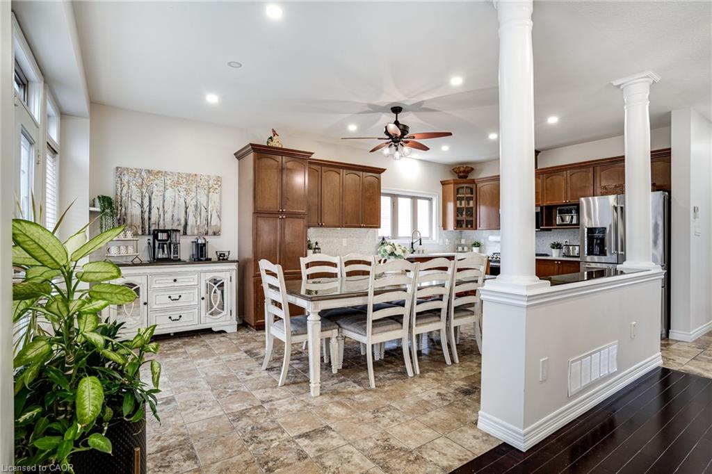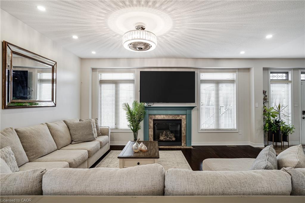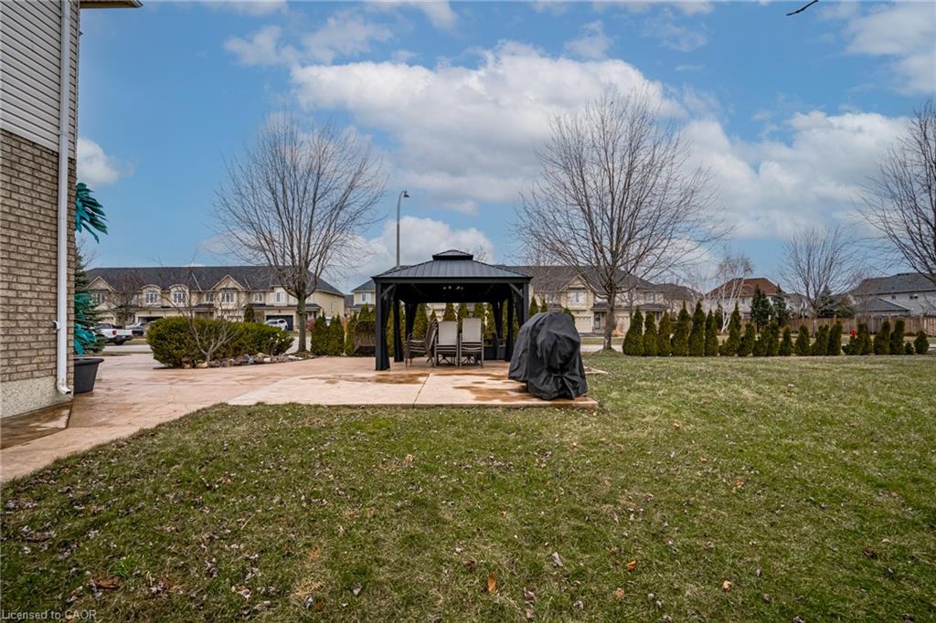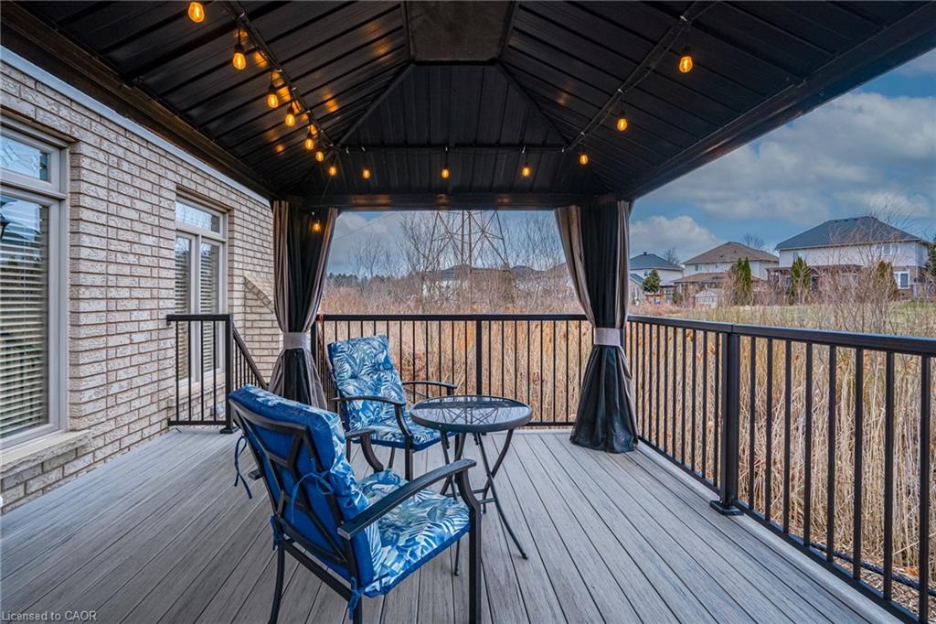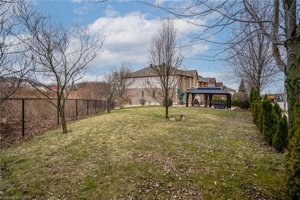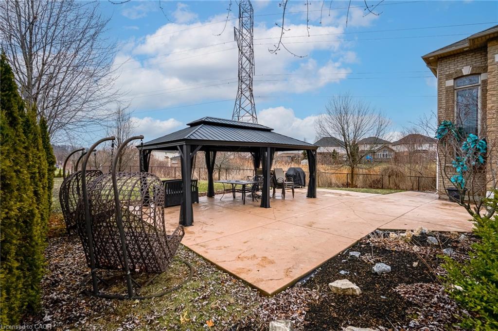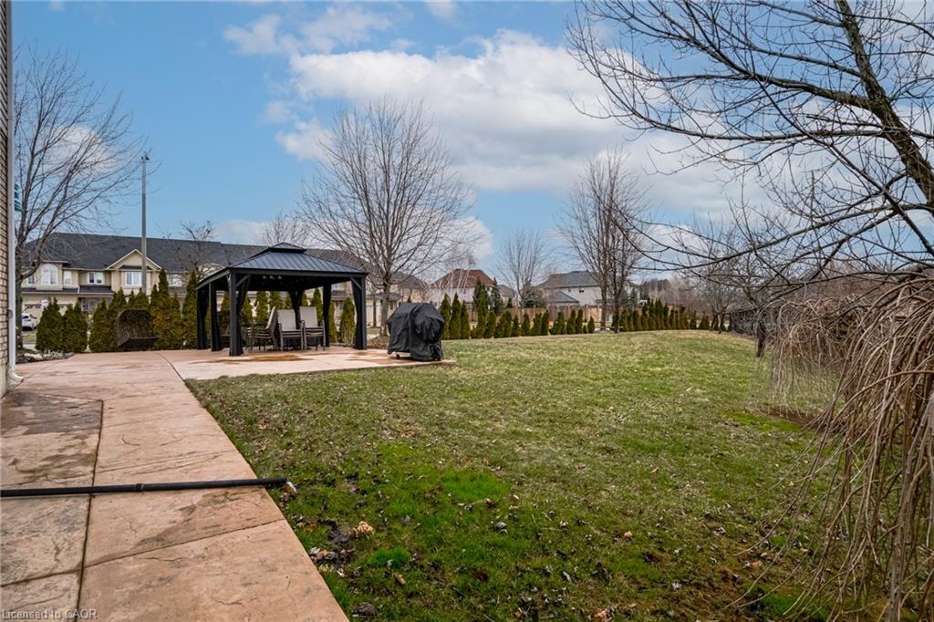Stunning Ancaster Meadowlands home on a rare double wide lot with no rear neighbours! Discover the perfect blend of space, privacy, and style in this all brick 4+1 bedroom, 3.5 bathroom home offering over 3,000 sq ft of finished living space. Situated on an extra wide lot, this property delivers the privacy and outdoor space families are searching for. The open concept main floor is designed for entertaining, featuring a gourmet eat in kitchen with stainless steel appliances, granite countertops, and direct sightlines into the oversized family room with cozy gas fireplace. A separate dining room, main floor mudroom/laundry, hardwood floors, pot lights, and inside access to the double car garage with epoxy flooring complete the level. Upstairs, unwind in the luxurious master retreat with walk-in closet and spa-like 5 piece ensuite bathroom. Three additional spacious bedrooms and a modern 4 piece bathroom provide plenty of room for the whole family. The fully finished basement offers incredible versatility with a large rec room, an extra bedroom, full bathroom, pantry, and ample storage. Step outside to your private backyard oasis—a generous double wide yard with no rear neighbours, a stylish composite deck (2019), stamped concrete patios, and a large double gazebo—perfect for relaxing or hosting friends. With a new roof (2021), upgraded attic insulation, and central vac, this home is move-in ready. Ideally located near schools, parks, shopping, and with excellent highway and transit access, this is a rare opportunity in the heart of Meadowlands.