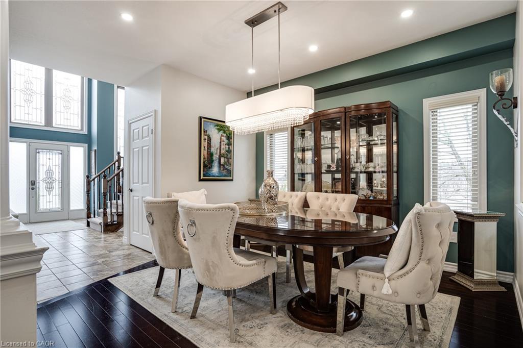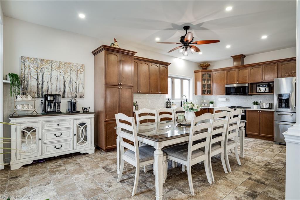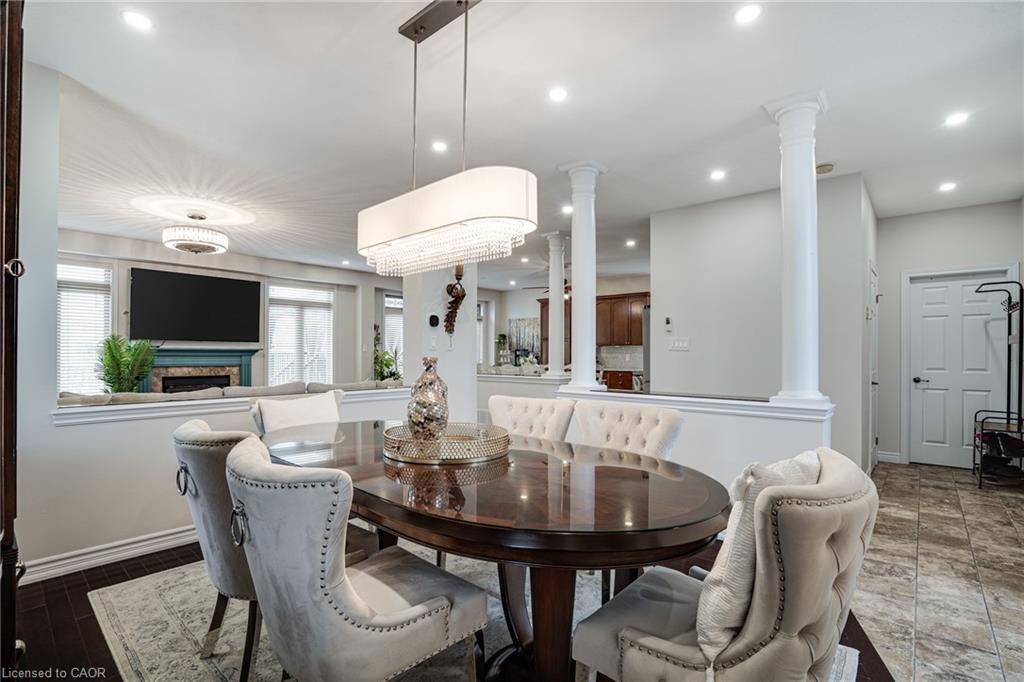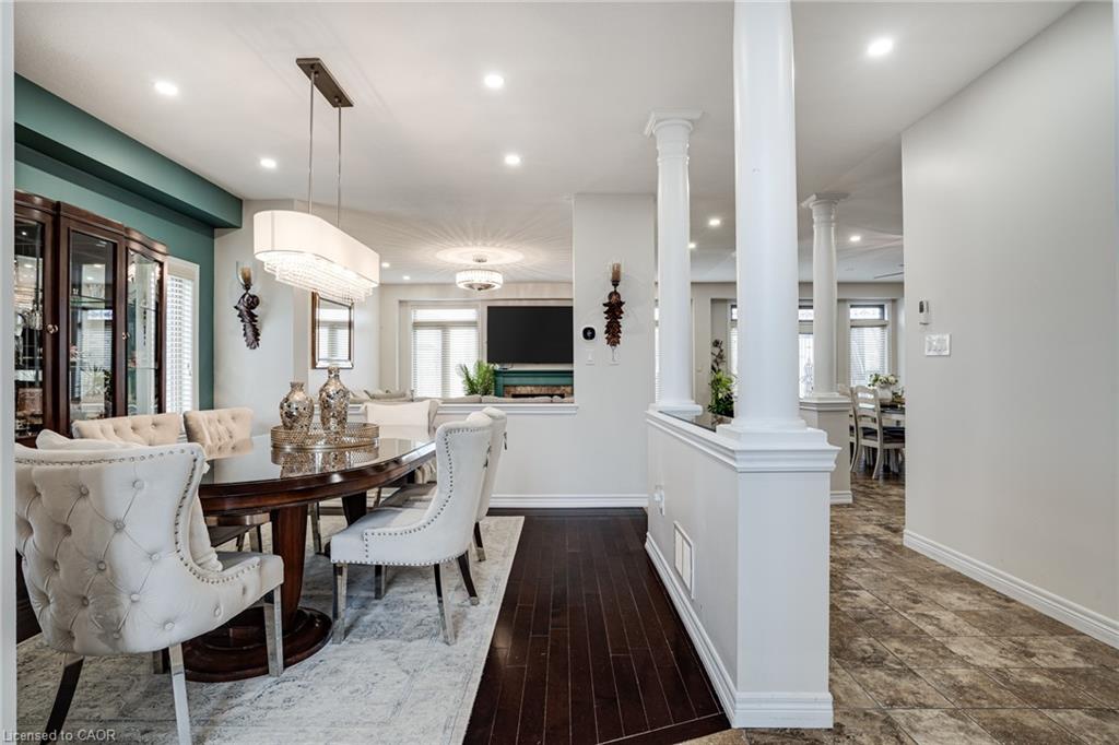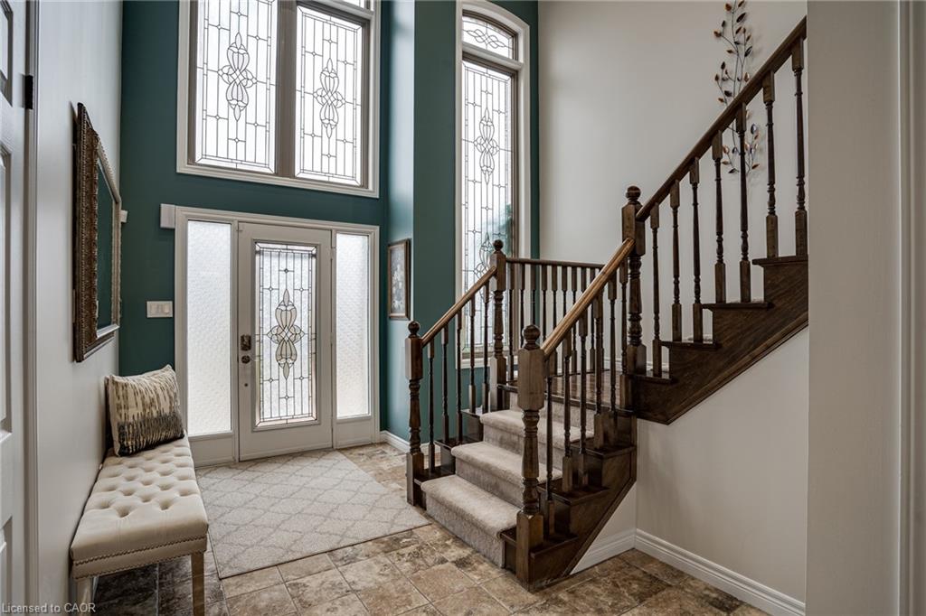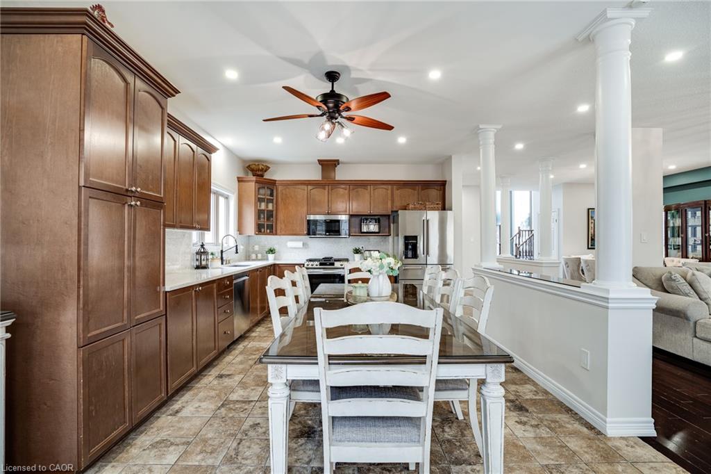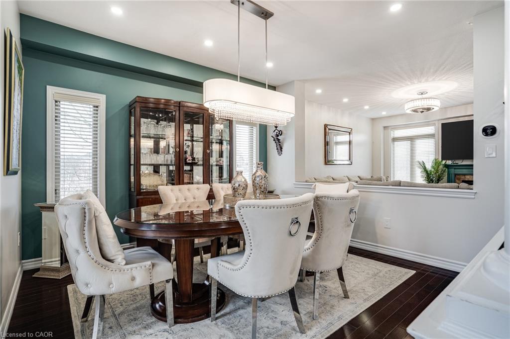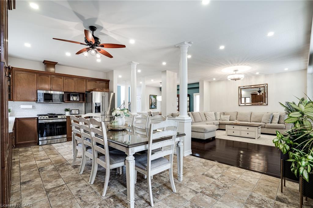 Stunning Ancaster Meadowlands home on a rare double wide lot with no rear neighbours! Discover the perfect blend of space, privacy, and style in this all brick 4+1 bedroom, 3.5 bathroom home offering over 3,000 sq ft of finished living space. Situated on an extra wide lot, this property delivers the privacy and outdoor space families are searching for. The open concept main floor is designed for entertaining, featuring a gourmet eat in kitchen with stainless steel appliances, granite countertops, and direct sightlines into the oversized family room with cozy gas fireplace. A separate dining room, main floor mudroom/laundry, hardwood floors, pot lights, and inside access to the double car garage with epoxy flooring complete the level. Upstairs, unwind in the luxurious master retreat with walk-in closet and spa-like 5 piece ensuite bathroom. Three additional spacious bedrooms and a modern 4 piece bathroom provide plenty of room for the whole family. The fully finished basement offers incredible versatility with a large rec room, an extra bedroom, full bathroom, pantry, and ample storage. Step outside to your private backyard oasis—a generous double wide yard with no rear neighbours, a stylish composite deck (2019), stamped concrete patios, and a large double gazebo—perfect for relaxing or hosting friends. With a new roof (2021), upgraded attic insulation, and central vac, this home is move-in ready. Ideally located near schools, parks, shopping, and with excellent highway and transit access, this is a rare opportunity in the heart of Meadowlands.