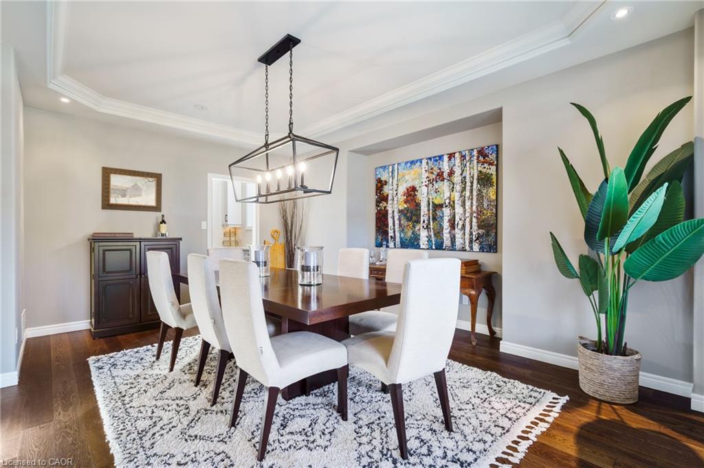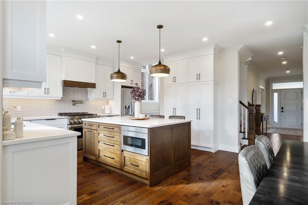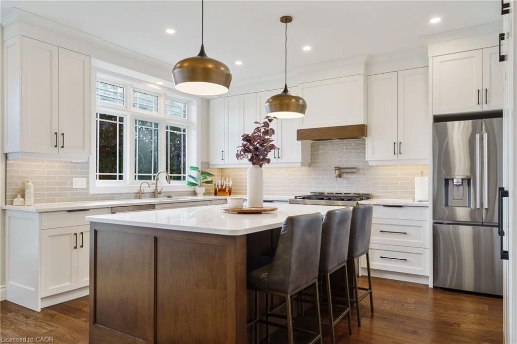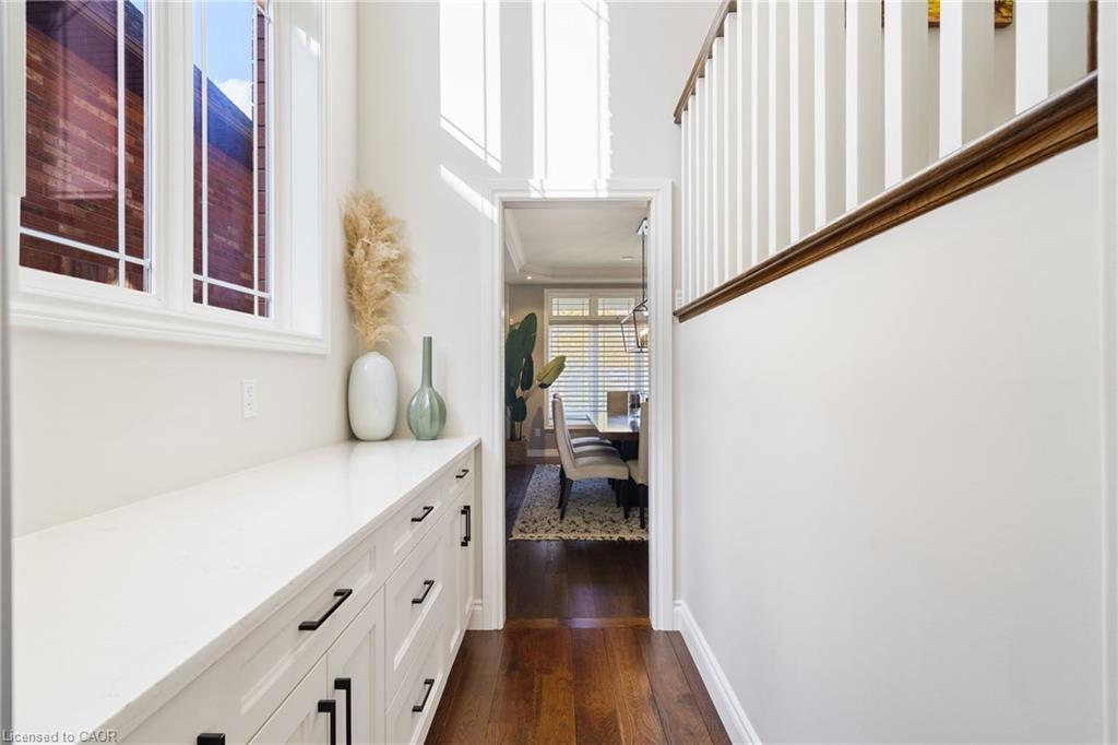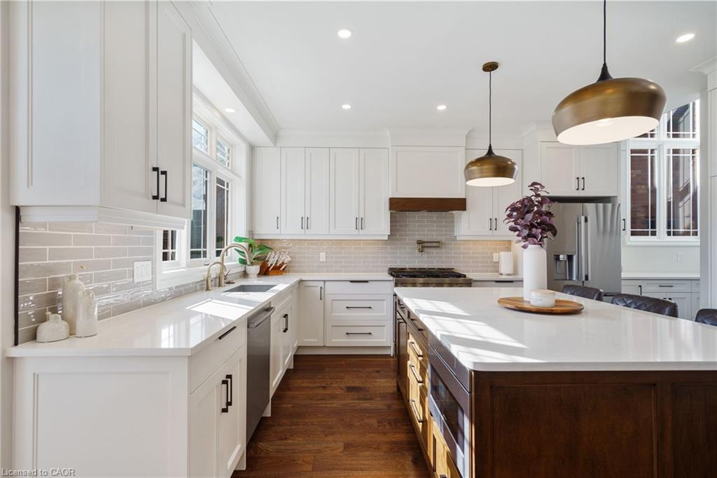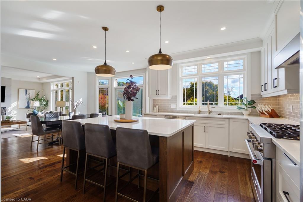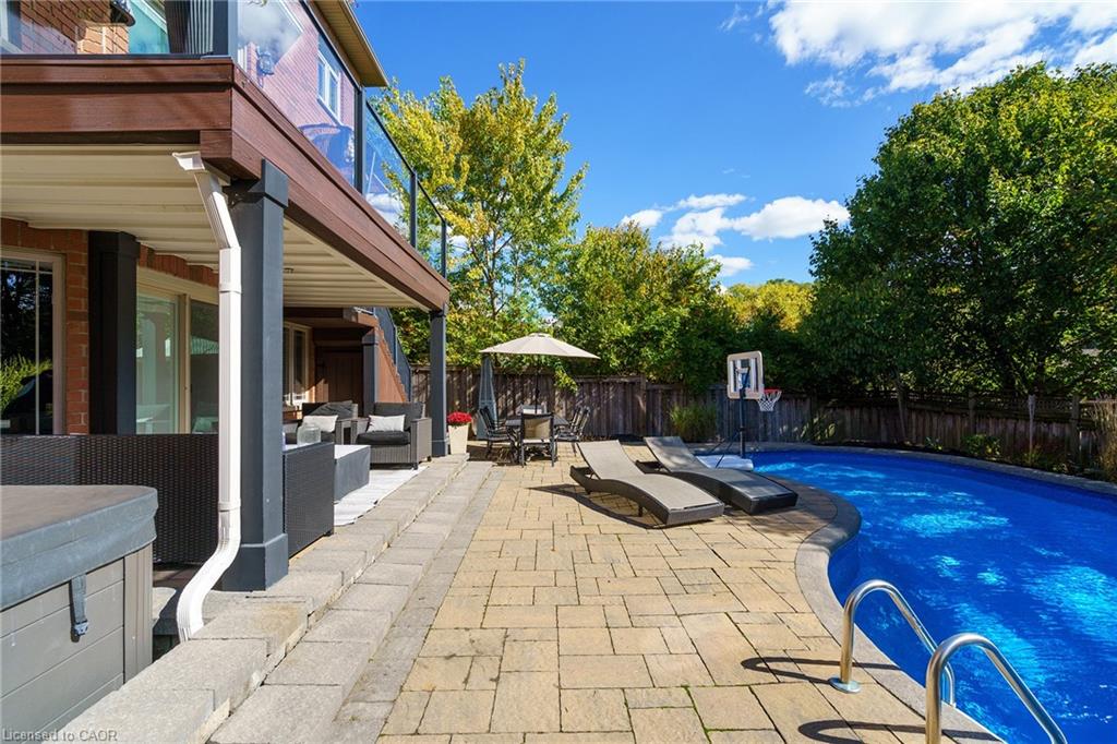 Tucked away in a quiet enclave of executive homes, this beautifully renovated 4 + 2 bedroom home offers over 4,000 sq ft of finished living space with excellent highway access and exceptional curb appeal. The main floor was fully renovated in 2023 and showcases hardwood flooring throughout, a stunning custom kitchen with an oversized island with seating, high end stainless steel appliances, quartz counters, a dedicated coffee/bar station, dining area and a convenient servery leading to the formal dining room. A bright living room with a new linear gas fireplace and abundant natural light creates an inviting open concept space. The main level also features a custom home office with built-ins, a mudroom with inside entry from the 2-car garage, and a walk out to the composite deck overlooking the backyard + a 2 pc powder room. Upstairs, the impressive primary suite includes a spacious walk-in closet, sitting area, and luxurious 5 pc ensuite with double sinks, soaker tub & glass enclosed shower. All bedrooms are generously sized, most with walk-in closets, and all bathrooms have been fully renovated with modern finishes. Bedroom level laundry completes this floor. The fully finished walk out basement extends the living space with a large recreation area, two additional bedrooms, and a newly updated 3 pc bathroom. Step outside to a private, fully fenced, professionally landscaped backyard featuring an inground saltwater pool and hot tub — the perfect retreat for entertaining or relaxing. Front irrigation system, large transom windows, pot lights, high ceilings on both levels, cold cellar, plenty of storage and newer sliding doors & front door. An exceptional home offering luxury, function, and style in one of Ancaster’s most desirable pockets.