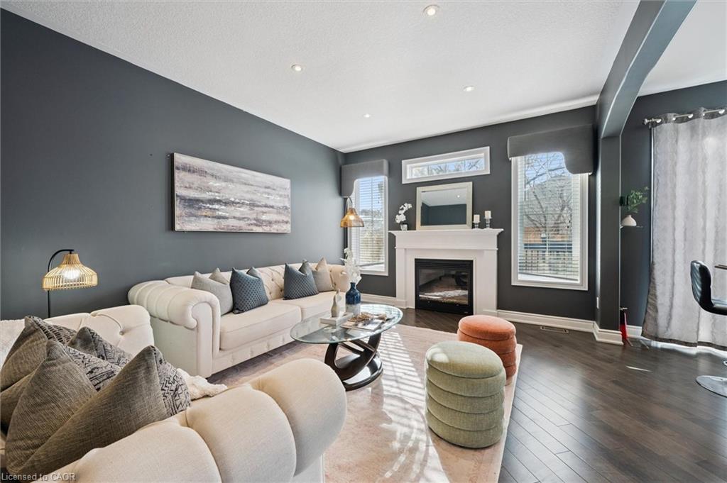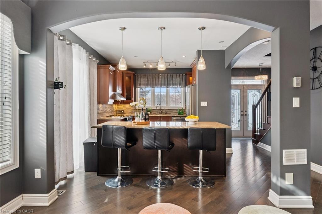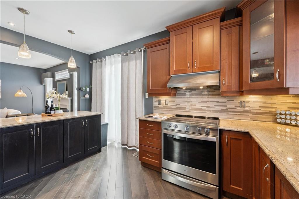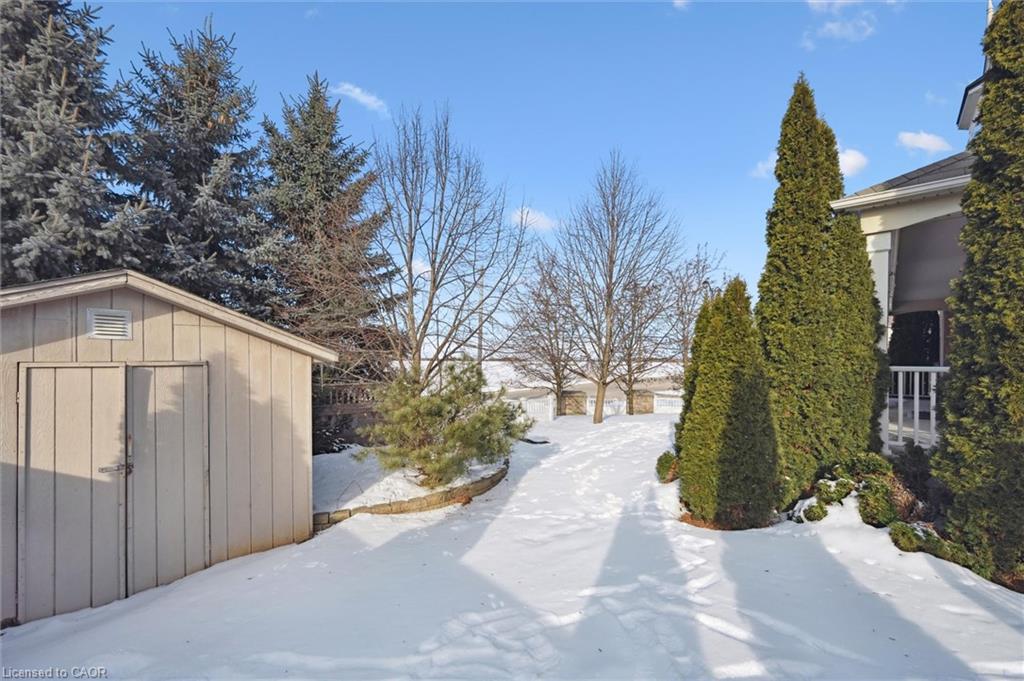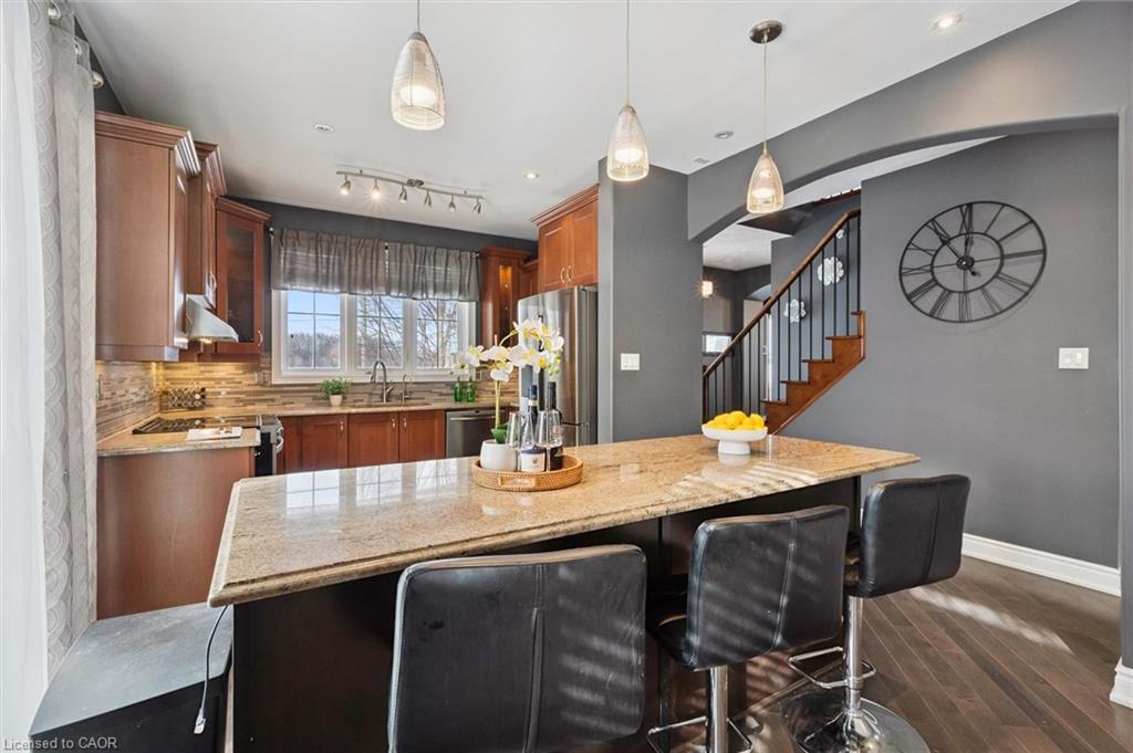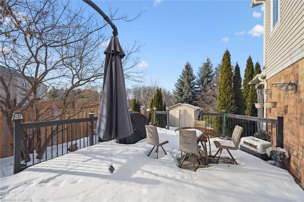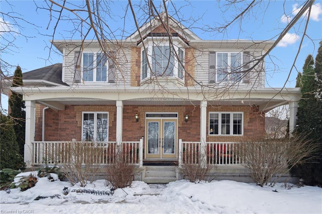Welcome to this beautifully updated 3+1 bedroom, 2.5 bathroom home, situated on a 50 ft lot in the sought after Mill Pond community of East Hespeler. Known for its family friendly atmosphere, mature streetscapes, parks, walking trails, and convenient access to major commuter routes, this neighbourhood is the perfect blend of comfort, convenience, and community. Amazing curb appeal with covered veranda & double front doors. Inside, you’ll find carpet free living with 9 foot ceilings and maple hardwood flooring(Jan '20) flowing seamlessly throughout the main level. The renovated kitchen is the heart of the home, thoughtfully redesigned to create a bright open concept layout ideal for entertaining. It features granite countertops, upgraded maple cabinetry with crown moulding, glass backsplash, under cabinet LED lighting, stainless steel appliances, and an 8 foot island with custom cabinetry & breakfast bar seating. Sliding patio doors lead directly to the backyard. The spacious living room offers pot lights, 5½" baseboards, and cozy gas fireplace with classic white mantel and overhead transom. The expansive dining room, with soaring ceilings and abundant windows, is flooded with natural light and perfect for hosting large gatherings. Convenient inside entry to the double car garage. Upstairs, you’ll find three generously sized bedrooms along with the convenience of bedroom level laundry. The primary suite is a retreat featuring a large walk-in closet and luxurious 5 pc ensuite with double sinks, granite countertop, corner Jacuzzi tub, and upgraded glass shower with marble seat. An additional 4 pc bathroom completes this level. The fully finished basement has a large rec room, 4th bedroom, rough-in for an additional bathroom, and a versatile office/storage room — perfect for guests, teens, or a home gym setup. Step outside to your private backyard oasis featuring a 16' x 24' cedar deck with BBQ gas line, a hot tub, and 10' x 10 shed. Central Vac throughout.
