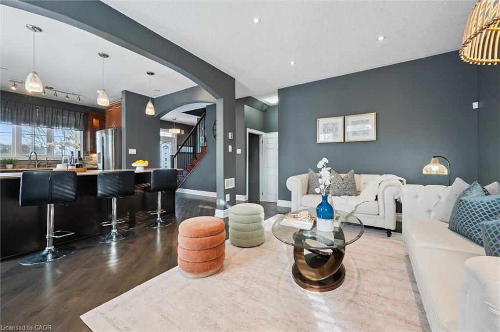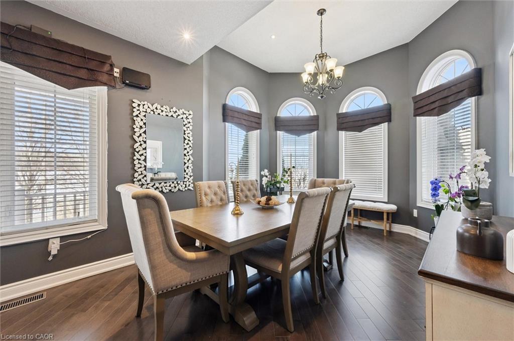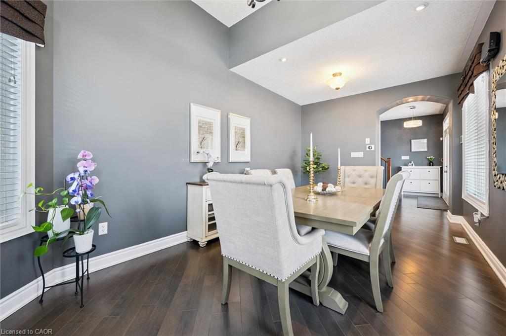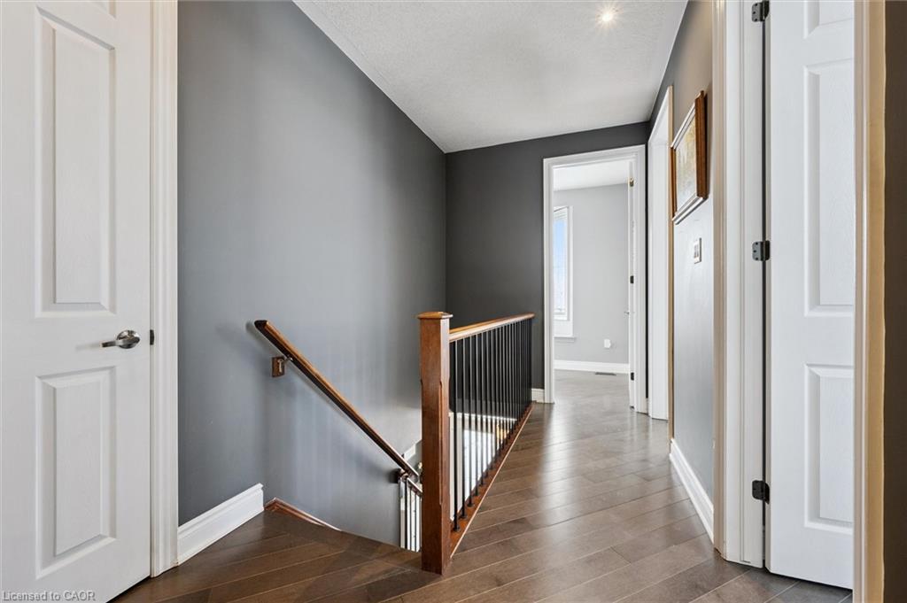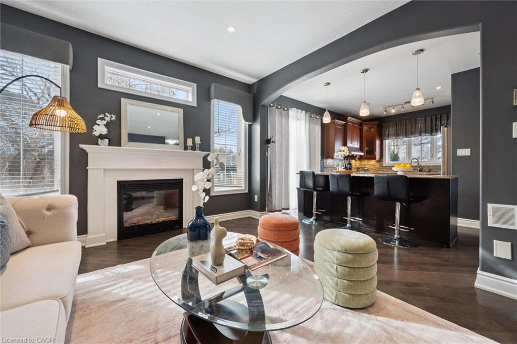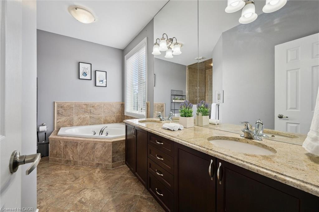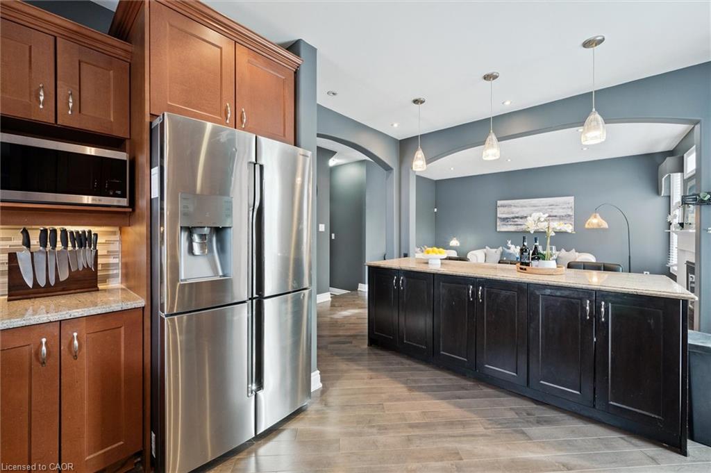 Welcome to this beautifully updated 3+1 bedroom, 2.5 bathroom home, situated on a 50 ft lot in the sought after Mill Pond community of East Hespeler. Known for its family friendly atmosphere, mature streetscapes, parks, walking trails, and convenient access to major commuter routes, this neighbourhood is the perfect blend of comfort, convenience, and community. Amazing curb appeal with covered veranda & double front doors. Inside, you’ll find carpet free living with 9 foot ceilings and maple hardwood flooring(Jan '20) flowing seamlessly throughout the main level. The renovated kitchen is the heart of the home, thoughtfully redesigned to create a bright open concept layout ideal for entertaining. It features granite countertops, upgraded maple cabinetry with crown moulding, glass backsplash, under cabinet LED lighting, stainless steel appliances, and an 8 foot island with custom cabinetry & breakfast bar seating. Sliding patio doors lead directly to the backyard. The spacious living room offers pot lights, 5½" baseboards, and cozy gas fireplace with classic white mantel and overhead transom. The expansive dining room, with soaring ceilings and abundant windows, is flooded with natural light and perfect for hosting large gatherings. Convenient inside entry to the double car garage. Upstairs, you’ll find three generously sized bedrooms along with the convenience of bedroom level laundry. The primary suite is a retreat featuring a large walk-in closet and luxurious 5 pc ensuite with double sinks, granite countertop, corner Jacuzzi tub, and upgraded glass shower with marble seat. An additional 4 pc bathroom completes this level. The fully finished basement has a large rec room, 4th bedroom, rough-in for an additional bathroom, and a versatile office/storage room — perfect for guests, teens, or a home gym setup. Step outside to your private backyard oasis featuring a 16' x 24' cedar deck with BBQ gas line, a hot tub, and 10' x 10 shed. Central Vac throughout.