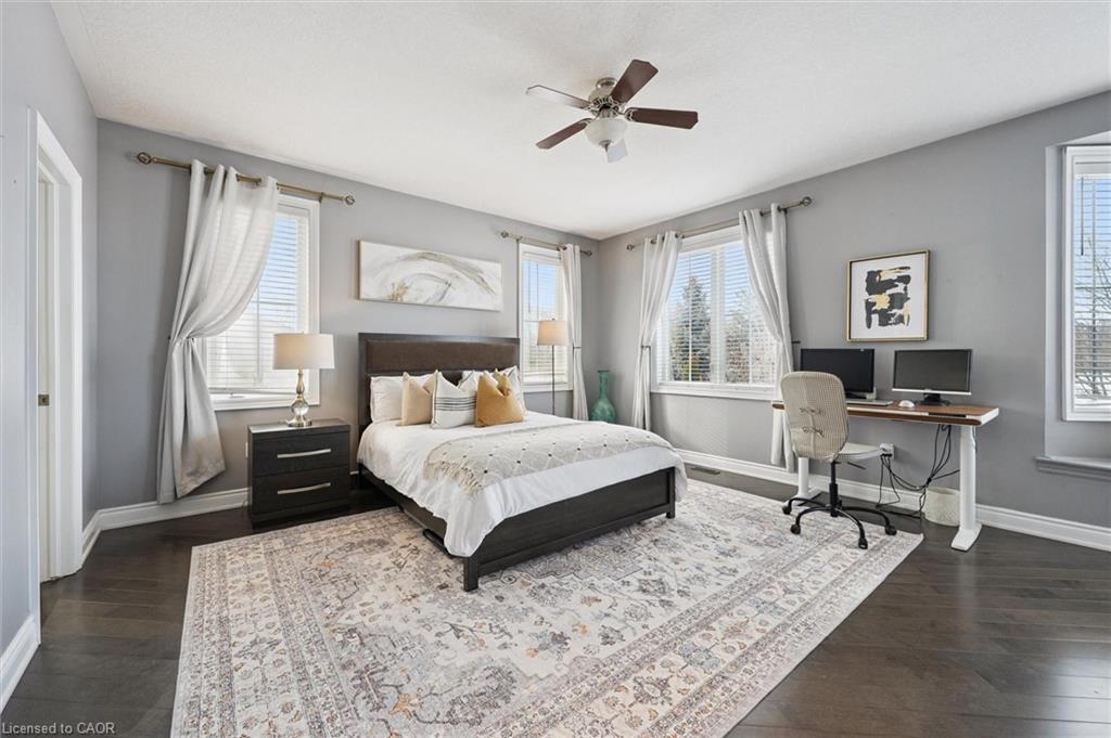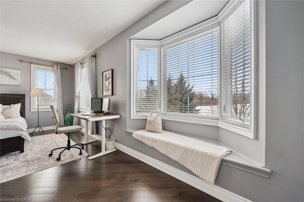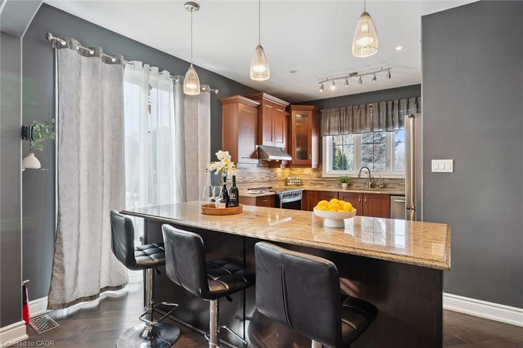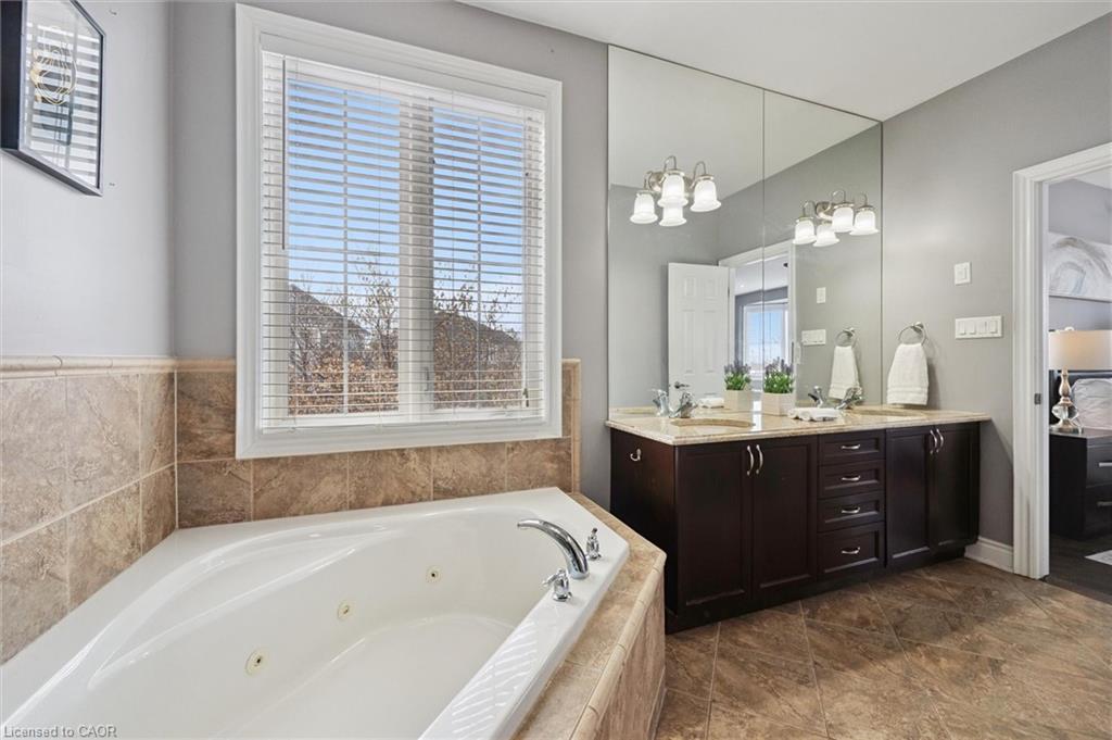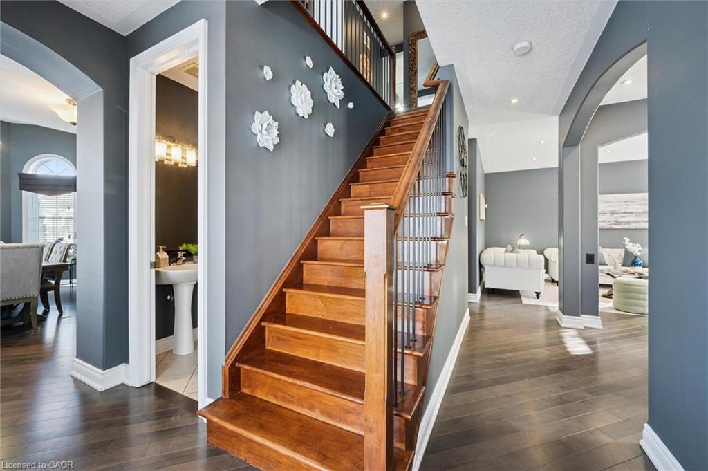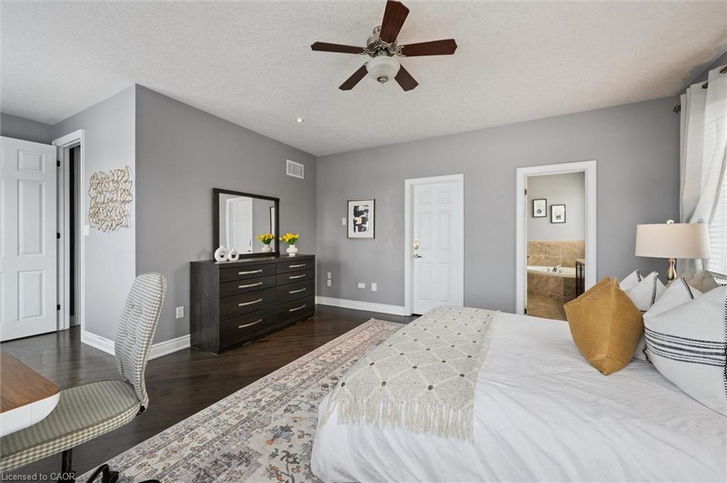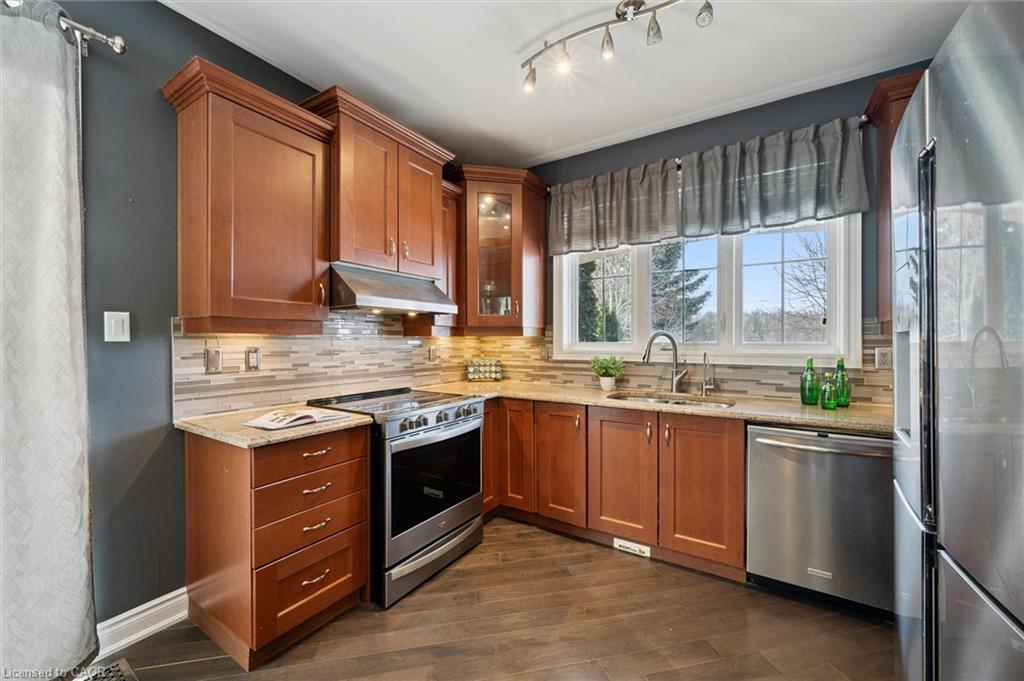 Welcome to this beautifully updated 3+1 bedroom, 2.5 bathroom home, situated on a 50 ft lot in the sought after Mill Pond community of East Hespeler. Known for its family friendly atmosphere, mature streetscapes, parks, walking trails, and convenient access to major commuter routes, this neighbourhood is the perfect blend of comfort, convenience, and community. Amazing curb appeal with covered veranda & double front doors. Inside, you’ll find carpet free living with 9 foot ceilings and maple hardwood flooring(Jan '20) flowing seamlessly throughout the main level. The renovated kitchen is the heart of the home, thoughtfully redesigned to create a bright open concept layout ideal for entertaining. It features granite countertops, upgraded maple cabinetry with crown moulding, glass backsplash, under cabinet LED lighting, stainless steel appliances, and an 8 foot island with custom cabinetry & breakfast bar seating. Sliding patio doors lead directly to the backyard. The spacious living room offers pot lights, 5½" baseboards, and cozy gas fireplace with classic white mantel and overhead transom. The expansive dining room, with soaring ceilings and abundant windows, is flooded with natural light and perfect for hosting large gatherings. Convenient inside entry to the double car garage. Upstairs, you’ll find three generously sized bedrooms along with the convenience of bedroom level laundry. The primary suite is a retreat featuring a large walk-in closet and luxurious 5 pc ensuite with double sinks, granite countertop, corner Jacuzzi tub, and upgraded glass shower with marble seat. An additional 4 pc bathroom completes this level. The fully finished basement has a large rec room, 4th bedroom, rough-in for an additional bathroom, and a versatile office/storage room — perfect for guests, teens, or a home gym setup. Step outside to your private backyard oasis featuring a 16' x 24' cedar deck with BBQ gas line, a hot tub, and 10' x 10 shed. Central Vac throughout.