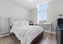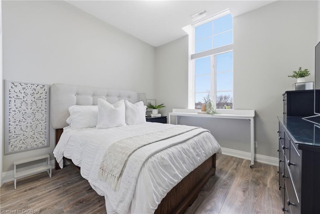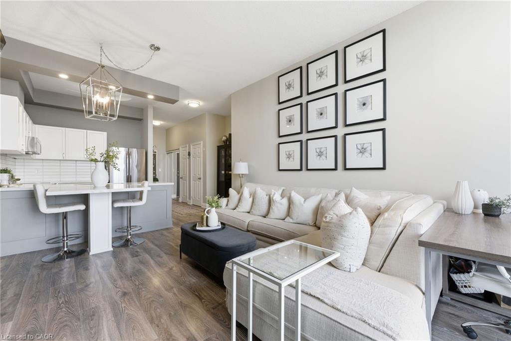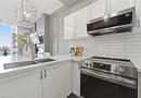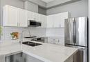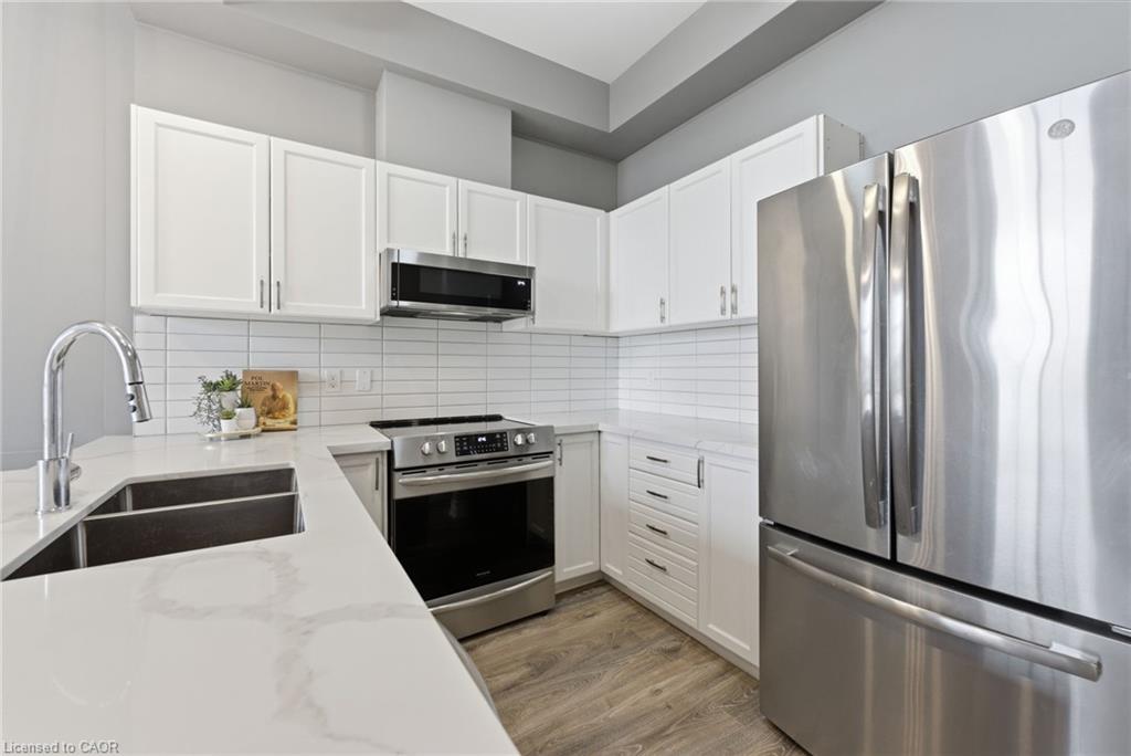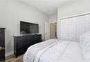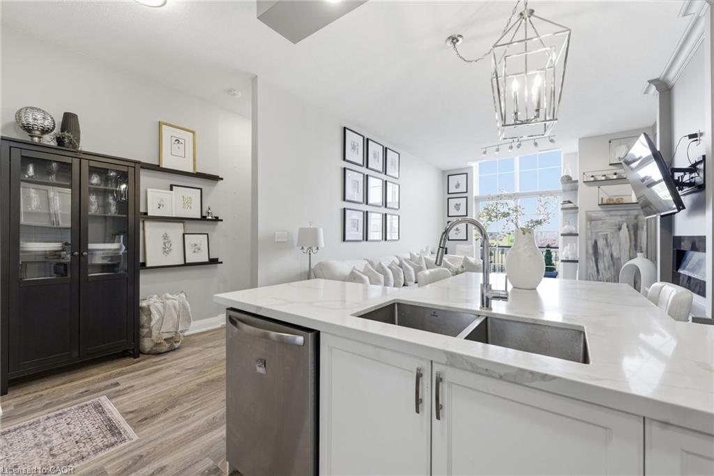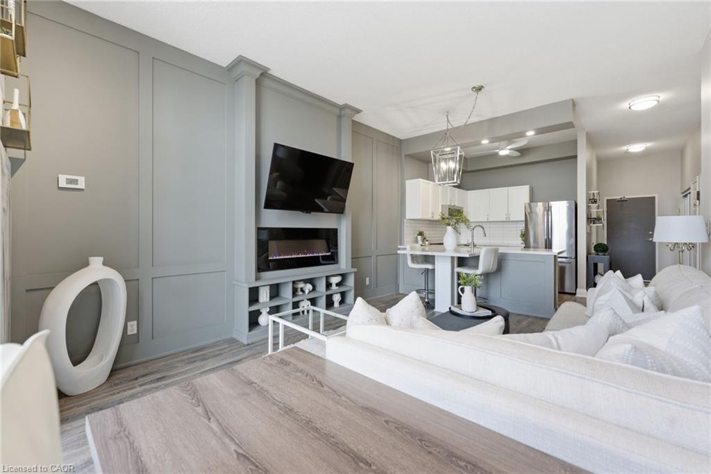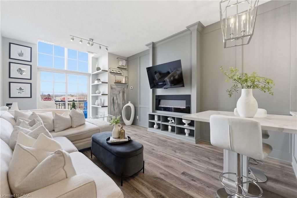 Stunning, renovated, and thoughtfully designed, this spacious suite offers a dream layout with stylish, chic upgrades at every turn. Sun-filled and beautifully appointed, the open concept living and dining area is anchored by a board and batten fireplace feature wall with an electric fireplace, custom built-in shelving, office nook and grand living space. Wide plank oak-inspired laminate flooring runs throughout, tying the space together with a clean, modern feel. Double sliding doors open to a private north-facing balcony, bringing in natural light The kitchen was fully custom-designed and features quartz countertops, a tile backsplash, white cabinetry, an undermount double sink, stainless steel appliances, and upgraded lighting. Polished and well-equipped for everyday cooking with a customized island breakfast bar/dining area to gather around. The primary bedroom is generously sized with an oversized window and a double door closet. The bathroom was renovated to match with patterned tile flooring, a custom glass shower door, upgraded wall tile, a custom vanity, and updated fixtures throughout. Storage is a standout. The spacious foyer includes a double sliding door entry closet, a linen/pantry-style closet, and an additional hallway storage closet, all with upgraded trim and casings. The oversized laundry and utility room adds even more flexibility with a utility sink and ample additional storage. Double sliding doors open to a private north-facing balcony, bringing in natural light overlooking everyday amenities within walking distance. This is a move-in ready home that delivers genuine value. A turn-the-key-and-unpack opportunity that doesn't come along often.