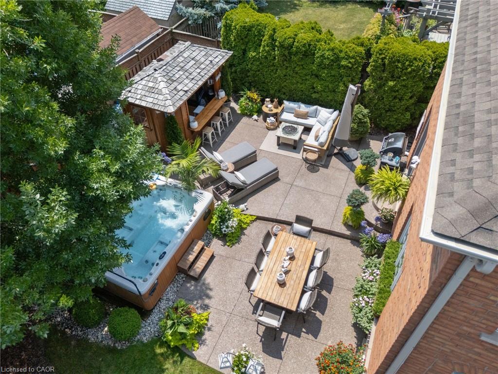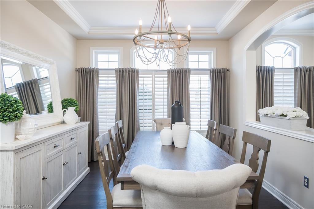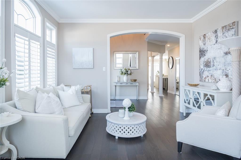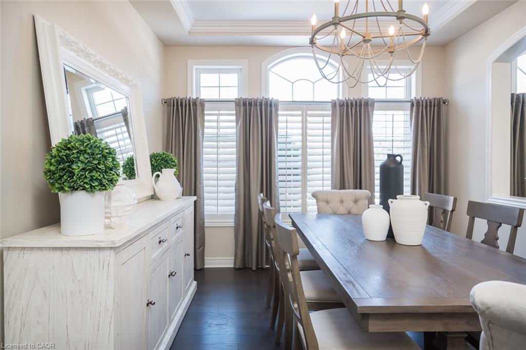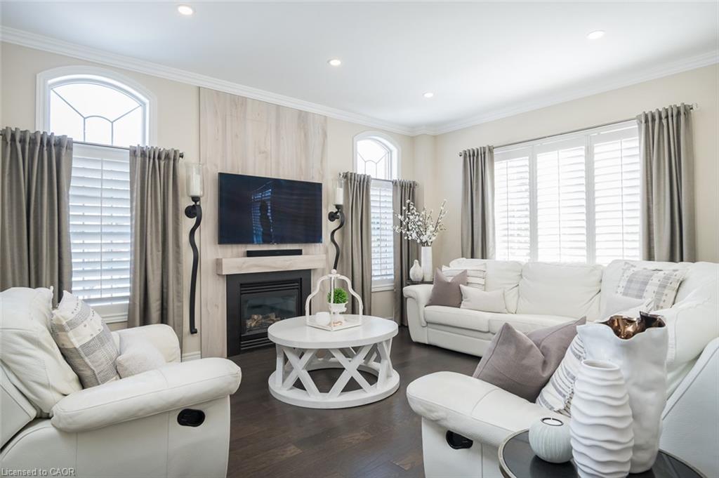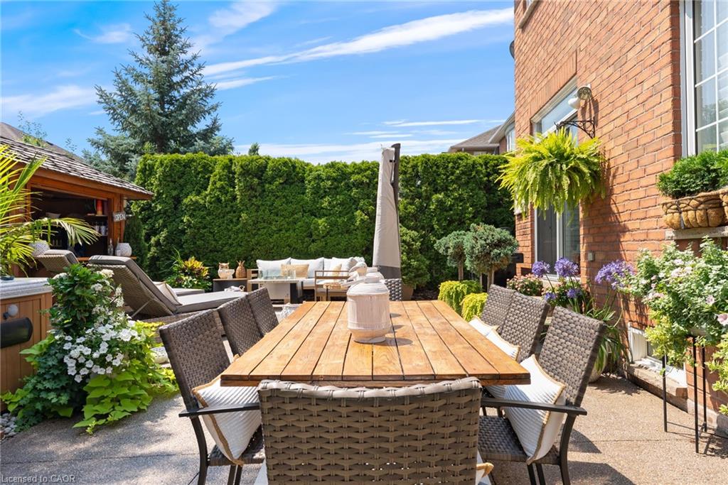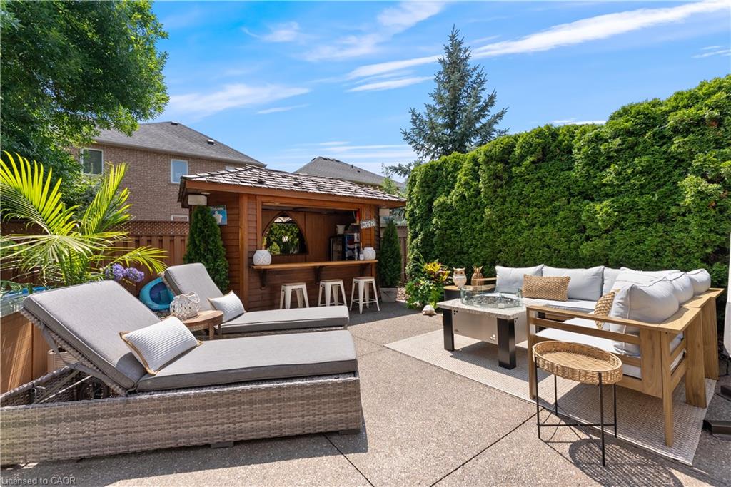 Exquisitely designed with a true model-home feel, this four-bedroom River Oaks home showcases elevated finishes and stunning upgrades that extend from its refined interior to the beautifully designed backyard retreat. A grand double-door entrance opens to an impressive foyer with open-to-above ceilings. Hardwood flooring runs throughout the main level, complemented by crown moulding, pot lights, and a hardwood staircase with wrought iron spindles. Arched windows with transoms and impressive ceiling height define the formal living room, finished with California shutters. A tray ceiling enhances the formal dining space, while the family room is anchored by a gas fireplace. The upgraded kitchen features white custom cabinetry, quartz countertops, a full slab backsplash, stainless steel appliances, and a generous island with breakfast bar seating. A bright eat-in area with sliding doors connects seamlessly to the rear yard. Upstairs, a spacious hallway leads to a generously sized primary retreat with ample closet space and a well-appointed five-piece ensuite. A second bedroom offers five-piece ensuite privilege, and two additional well-proportioned bedrooms provide flexibility for family, guests, or office space. The fully finished lower level adds valuable living space with a recreation area and built-in bar. Pot lighting and crown moulding enhance the ceiling detail, while a three-piece bathroom and multiple storage areas add everyday functionality. The backyard is designed for entertaining, featuring an expansive exposed aggregate patio, , hot tub, and custom cedar cabana bar, all surrounded by mature hedging for privacy. Located in the heart of River Oaks, close to top-rated schools, Oakville Hospital, parks, trails, shopping, and commuter routes, this home delivers elevated living in one of Oakville’s most established neighbourhoods.