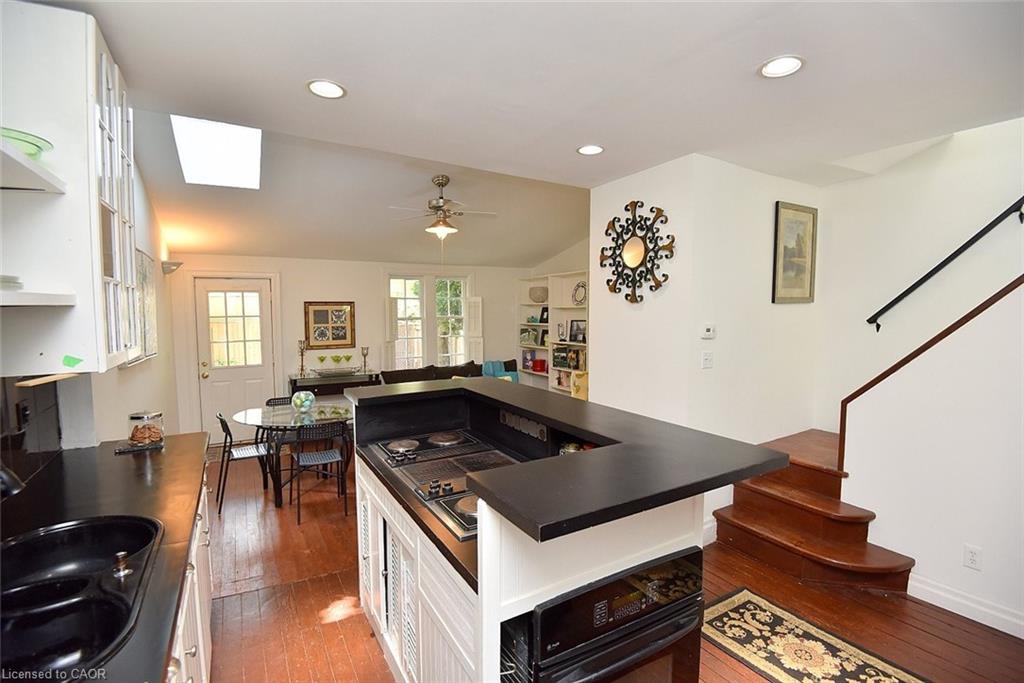 Be home for the holidays! 40 acres of panoramic Bayfront views, parks, trails, sailing, hiking, biking & restaurants- all steps from this charming 2 storey century cottage. Lovely front porch for your morning coffee. Open concept main floor with vaulted ceiling & skylights at the rear. Large kitchen island with Jenn Air cooktop grill & griddle with downdraft exhaust fan. Gas fireplace in cozy front living room. Primary bedroom created by joining 2 smaller rooms, has vaulted ceiling & loads of closets. 2nd bedroom overlooking rear yard. Newly tiled primary bathroom with soaker tub. Main floor powder room. Lower level den makes for a perfect home office with oversized egress window. Backyard is low maintenance with two-tiered deck with perimeter gardens & storage shed. Easy walk to West Harbour GO with full day service to Toronto, James St shopping, farmer’s market. Quick 403 & QEW access. Your home and year round retreat awaits you!