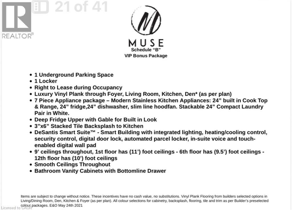 Be the First to Live in this 4th Floor Unit in The Muse Condos in Stoney Creek. Unit #422 offers 525 sq/ft plus a Large 82 sq/ft West facing balcony. This modern 1 Bedroom, 1 Bathroom has it all with 9' Ceilings, Floor-to-Ceiling Windows, Luxury vinyl plank flooring throughout, Quartz countertops, Pot lights, Brand New Stainless Steel Appliances with in-suite stackable Laundry. One underground Parking space & One Locker included. Bell Internet is FREE for the first year. Smart Building with Smart Suite includes integrated lighting, heating/cooling control, security control, digital door lock, automated parcel locker in front entrance, in-suite voice and touch enabled digital wall pad. The Smart Home features include app-based climate control, security, energy tracking, and digital access. Great Location for Commuters being just minutes from the new GO Station, Confederation Park, Van Wagner's Beach, scenic lakeview trails, shopping & restaurants. Ground floor commercial space and resident amenities, including a stunning 6th-floor lakeview terrace with BBQ(s) and seating areas, studio space, media lounge club room with chef's kitchen, art gallery, and pet spa. Great Condo For Lease in Stoney Creek and Condo to add to your Property Search. Smoke Free Building. RSA. (id:52316)