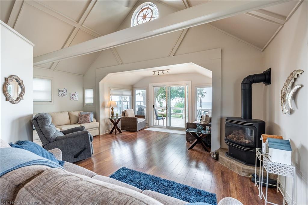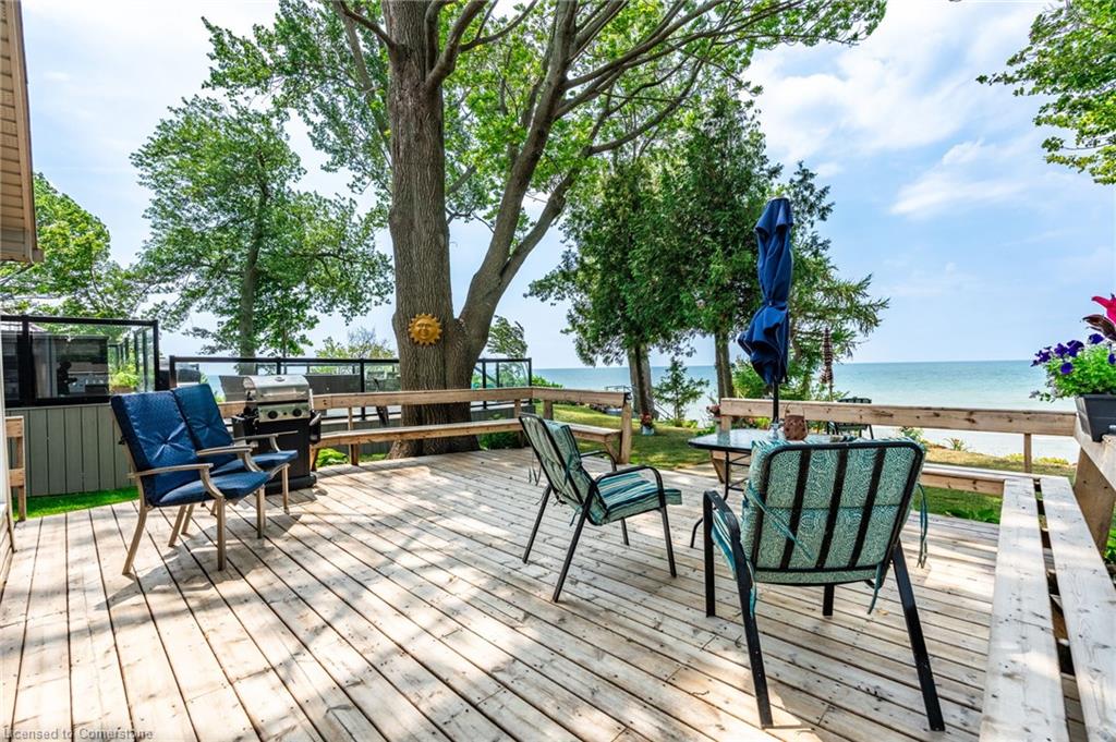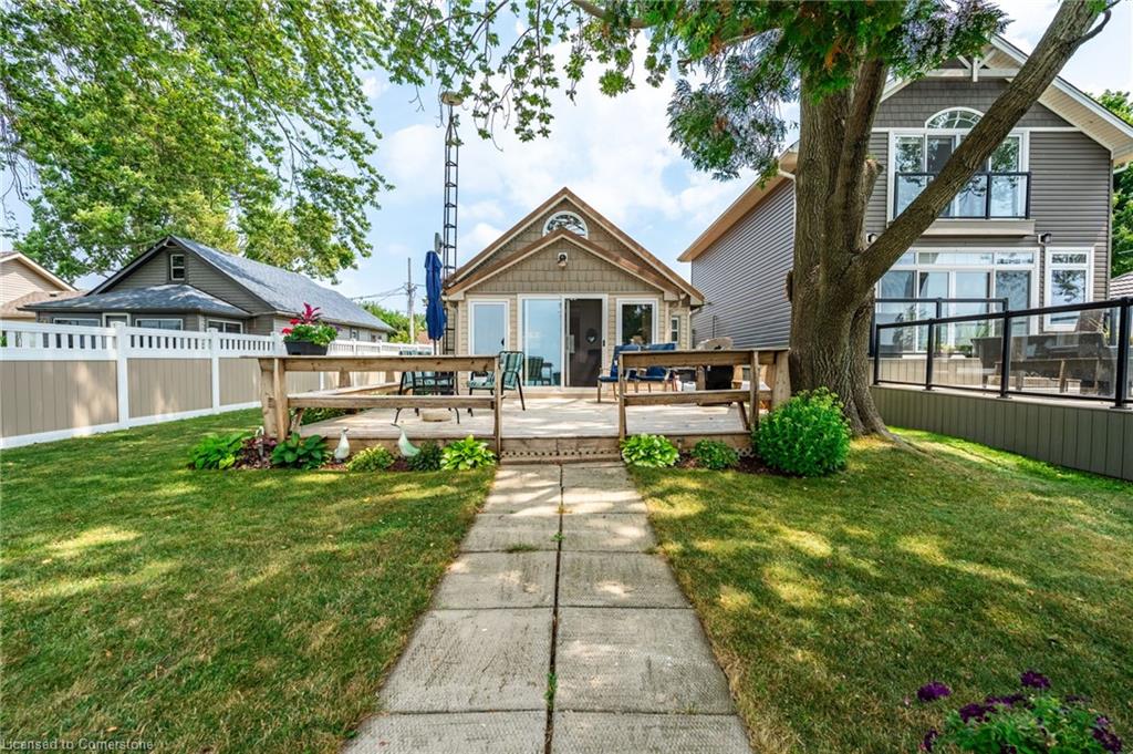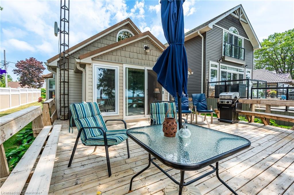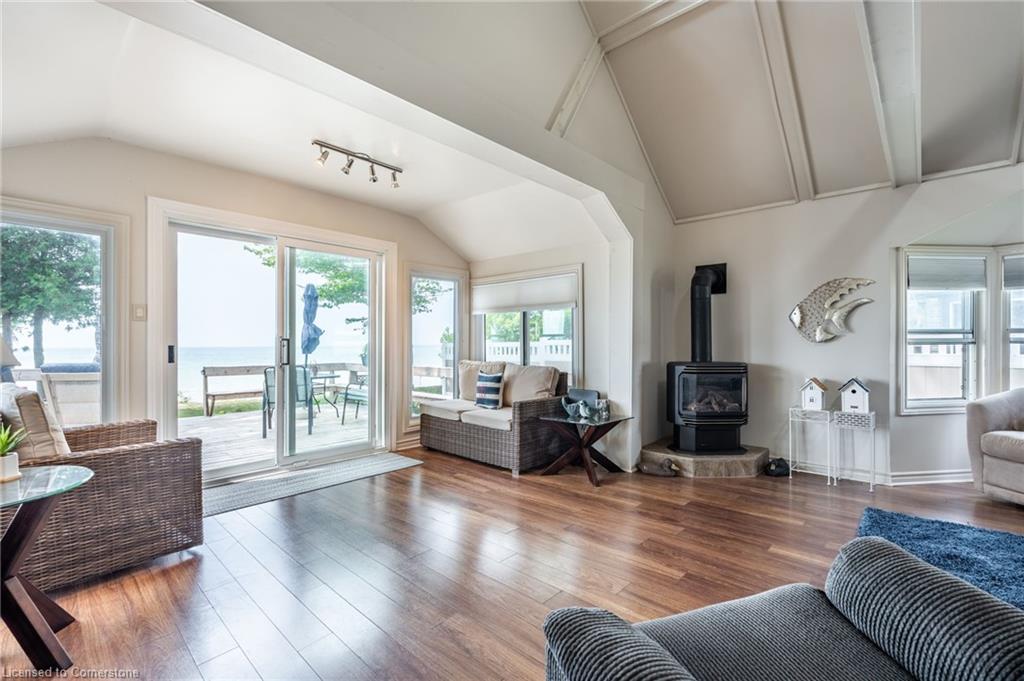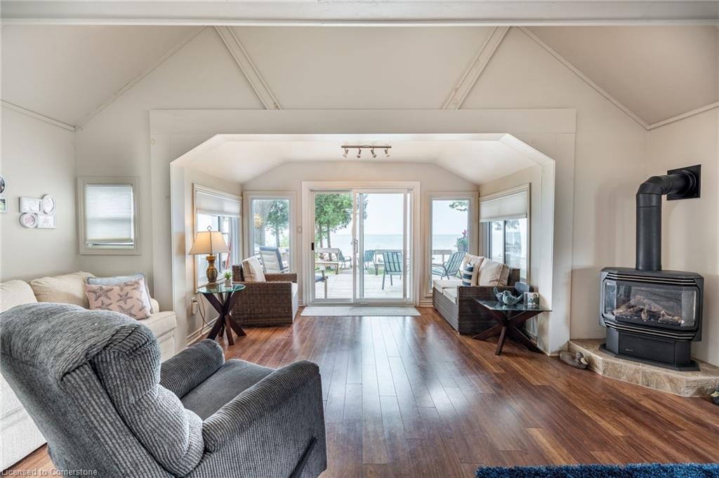 Clean, move in ready 4 season home directly on LAKE Erie in the friendly Peacock Point Community ! Just unpack your clothes and food and start enjoying life on the LAKE! This charming home offers year-round comfort and features a well-appointed kitchen with ample cabinetry, generous counter space, and stainless steel appliances. Open concept living area with WATER and sky views of the LAKE. Keep warm with the natural gas fireplace, perfect for relaxing evenings! Modern 3-piece bathroom adds convenience. You'll love the spacious loft- ideal for extra guests, sleeping bedroom area or a retreat, or home office. Situated directly on Lake Erie, this waterfront property boasts stunning lake views where you can feel the refreshing lake breeze from your front or rear deck plus lower patio & the second outdoor seating area. Additional highlights include a cistern for fresh water PLUS water is provided from Spring to Fall by the Peacock Point Community water system, (yearly cost = $315.00) Recent, professionally built concrete Break Wall with steel stairs to the sand and gravel Lake Erie Beach! Steel roof (2019). Fence 2024. Parking for up to three vehicles. Holding tank for waste water. Hot water tank owned. Natural gas (not propane). This turn-key getaway is a rare opportunity—don’t miss your chance to own a beautiful slice of lakeside paradise! Flexible closing! Enjoy your new home on Lake Erie NOW! Recent survey available.