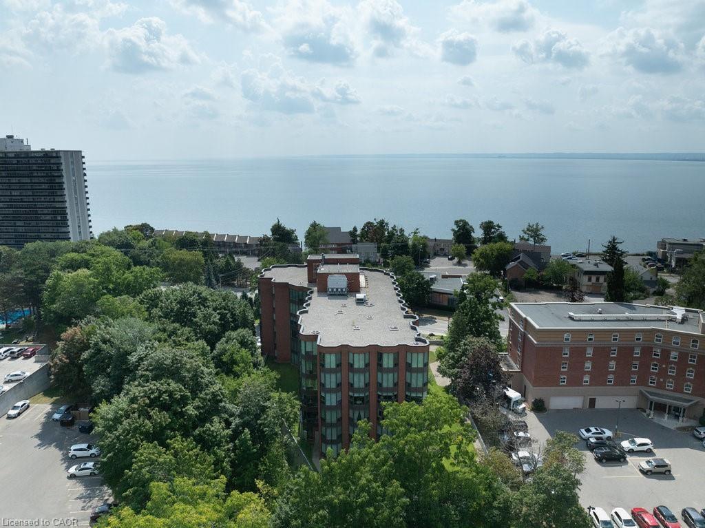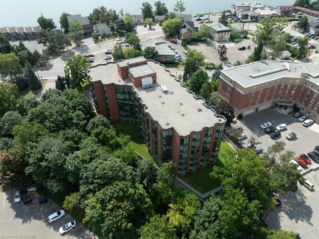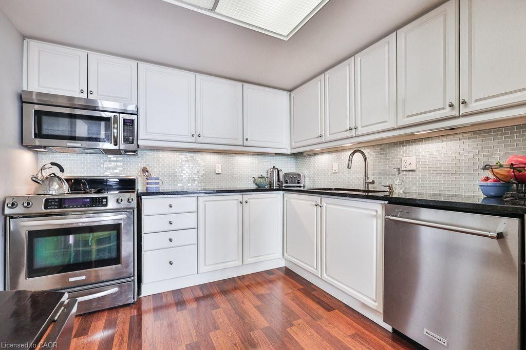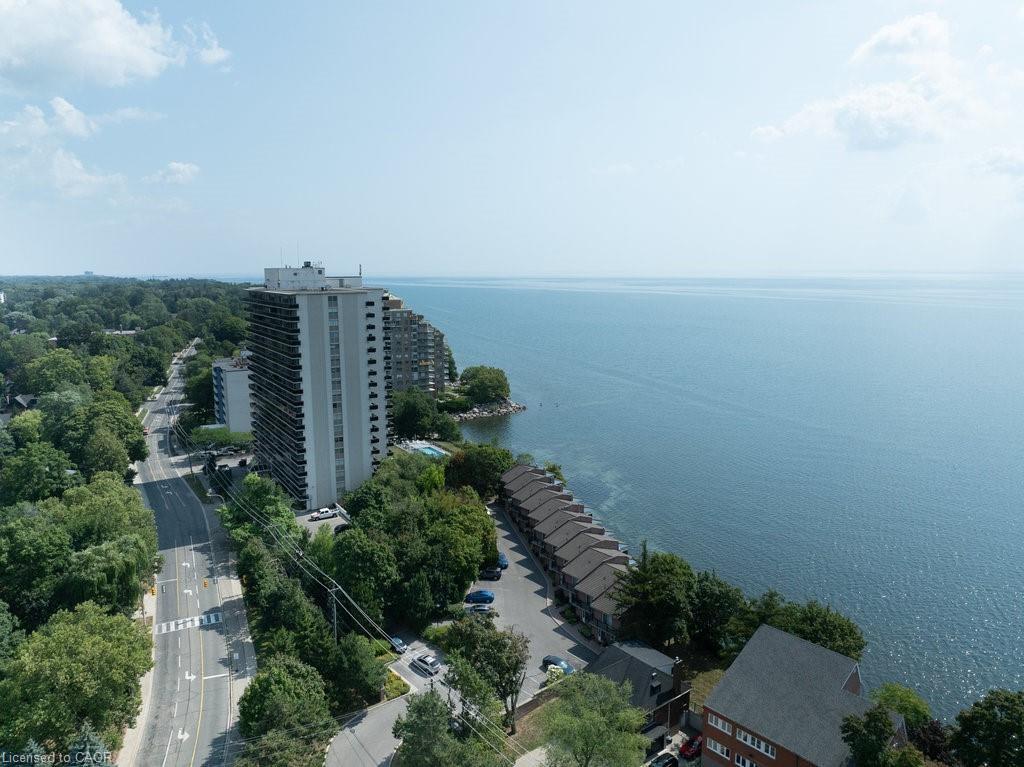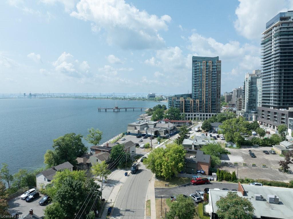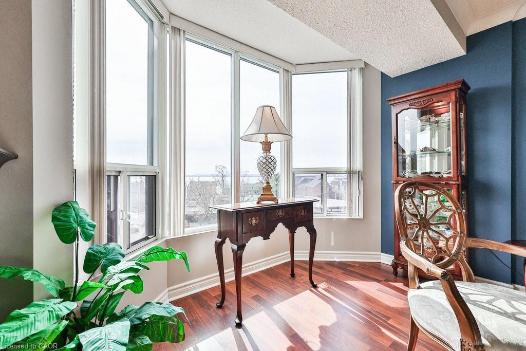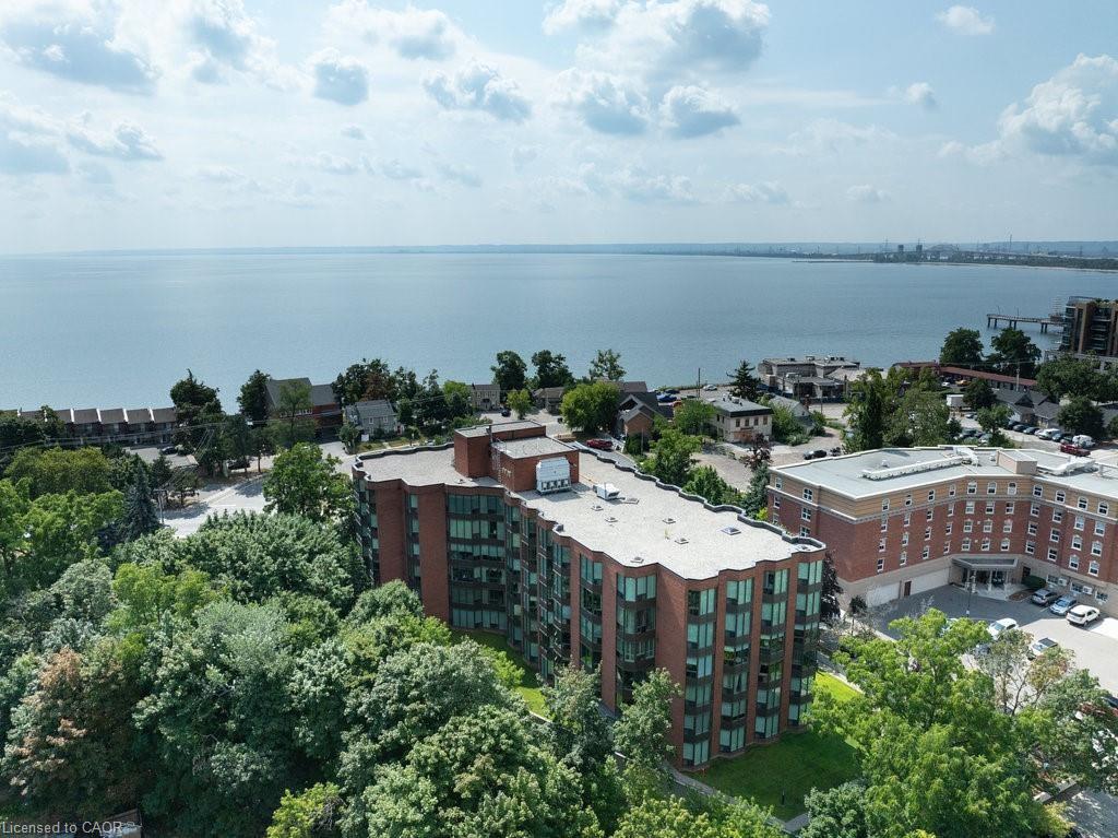 Welcome home. Fabulous downtown Burlington Waterfront living at the Village Gate. Boutique building with only 39 units offering luxury living and a downtown Burlington lifestyle. This 2 bedroom plus den suite is filled with natural light and enjoys lake views from all primary rooms. The spacious living and dining room is ideal for entertaining family and friends, the den with French doors offers a flex space for a home office or cozy movie space. The white wraparound kitchen features granite counters, glass backsplash and stainless appliances along with a breakfast area. Relax in your primary bedroom with lake views and a 3-piece ensuite, there is an additional bedroom for guests and a 4-piece bath. Beautiful landscaping and extensive outdoor space to enjoy with mature treeline and tranquil creek. All just a short stroll to all Downtown Burlington has to offer!