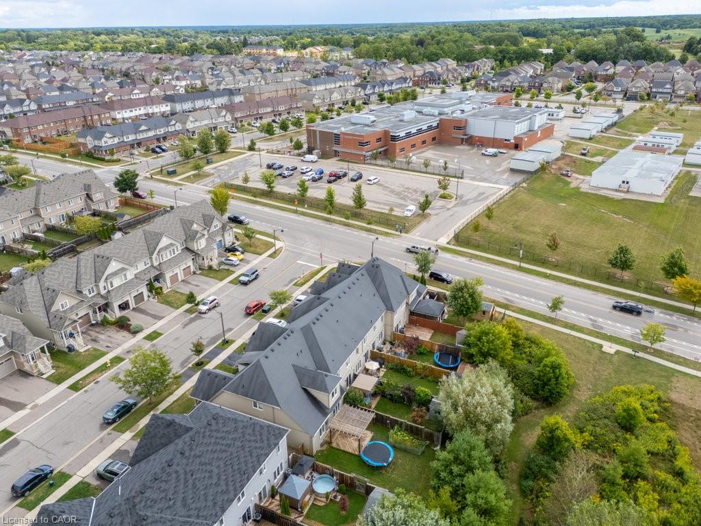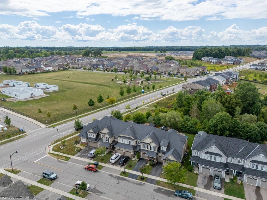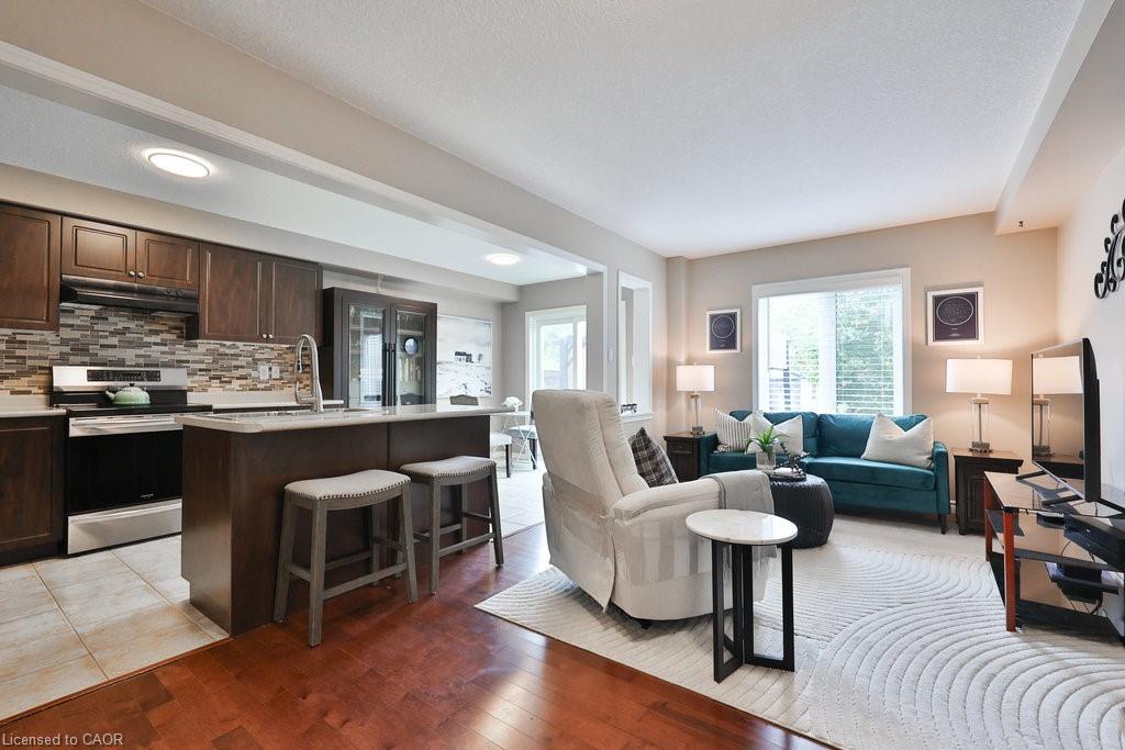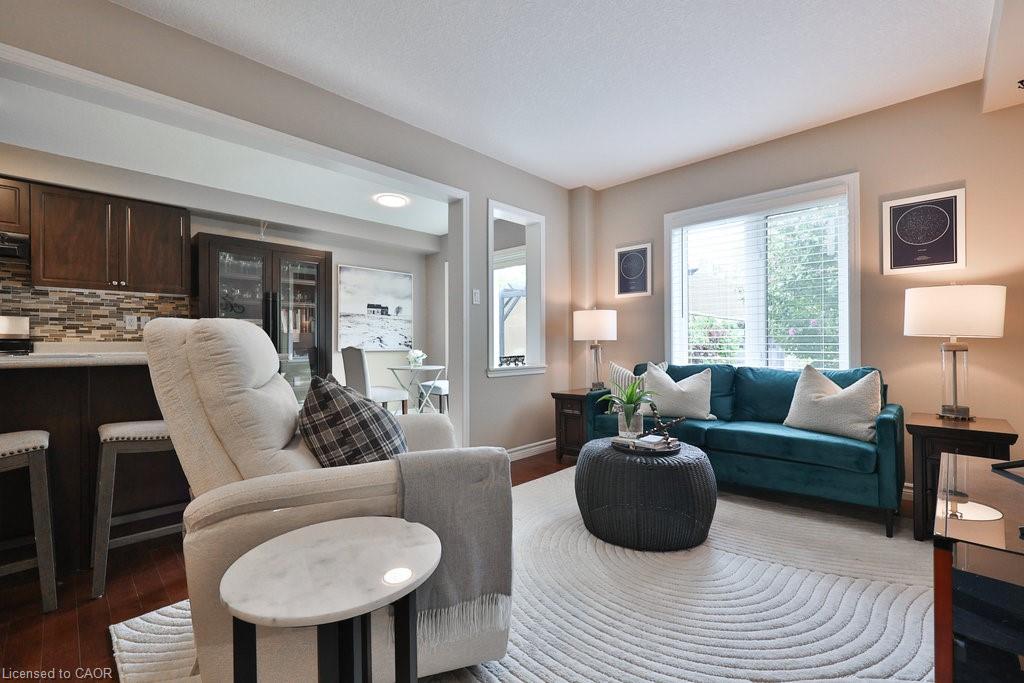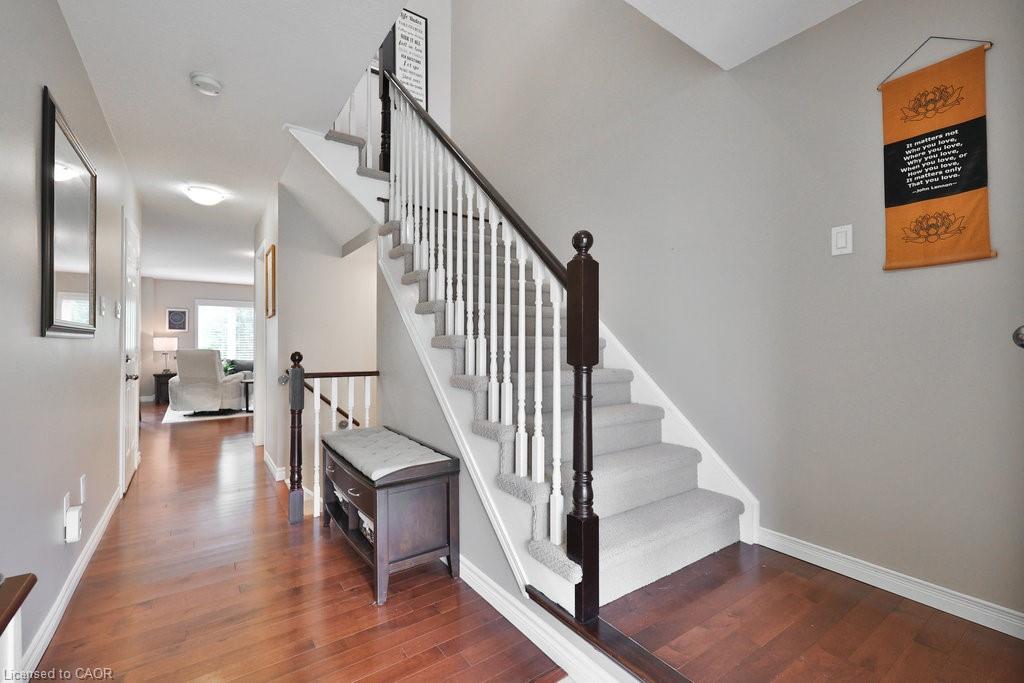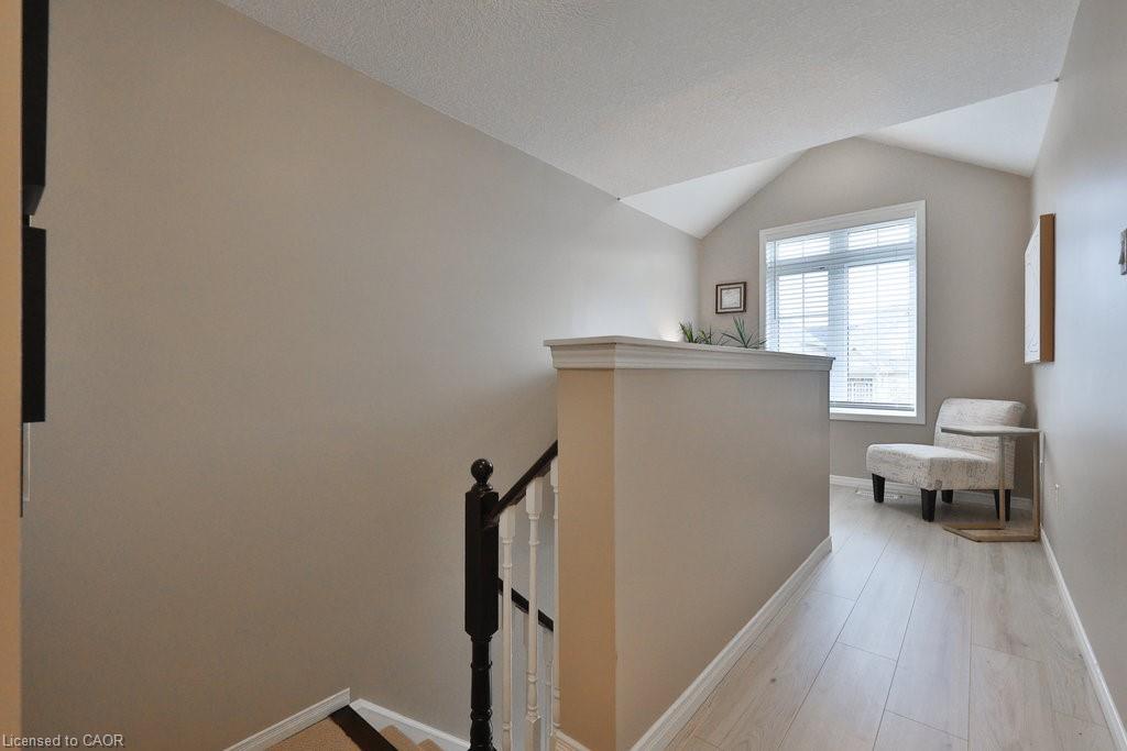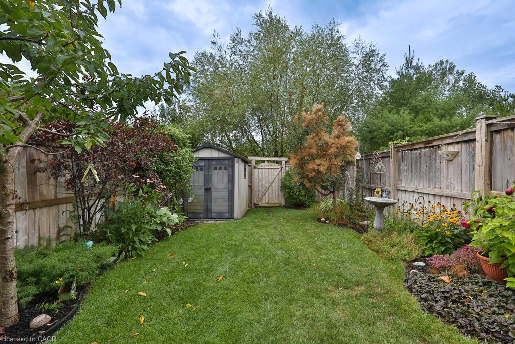 Welcome home. FREEHOLD – Beautifully maintained 3-bedroom, 3-bath townhouse offering 1,495 sq. ft. in the family-friendly West Brant community. Ideally situated close to schools, shopping, walking trails & parks. Premium lot backing onto a pond with no rear neighbours! Move-in ready home features a single-car garage with inside entry, custom new front door, hardwood flooring on the main level and 9’ ceilings. The open-concept living/dining area flows into an eat-in kitchen with updated stainless steel appliances, and a centre island for additional prep space. Newer sliding doors lead to a fully fenced backyard oasis, perfect for extending your living space outdoors. A gardener’s delight that feels like country living within the city. Upstairs you’ll find newer vinyl flooring, a spacious primary suite with walk-in closet and ensuite with an oversized shower, 2 additional bedrooms, a bright home office nook and a 4-pc bathroom. Stylish finishes, bright open layout, and a premium pond lot with a backyard oasis…this one won’t disappoint!