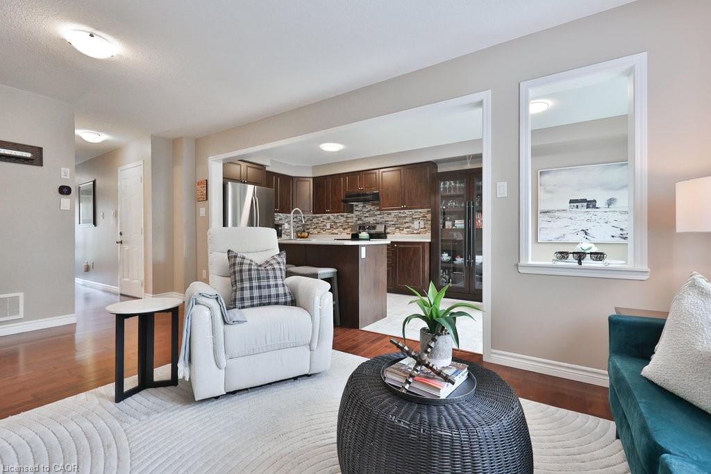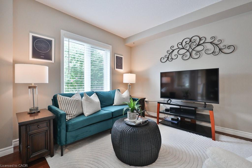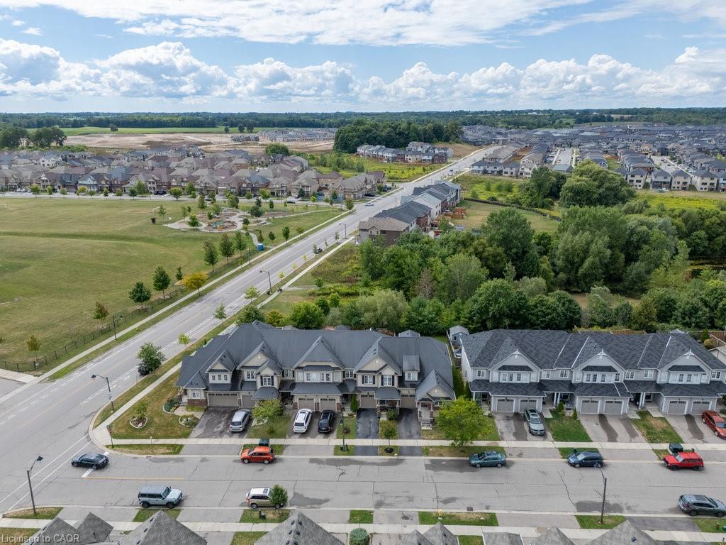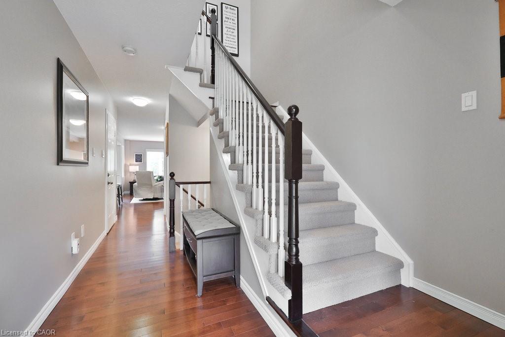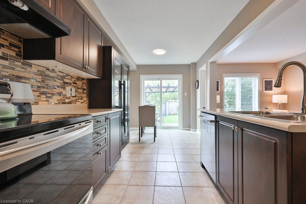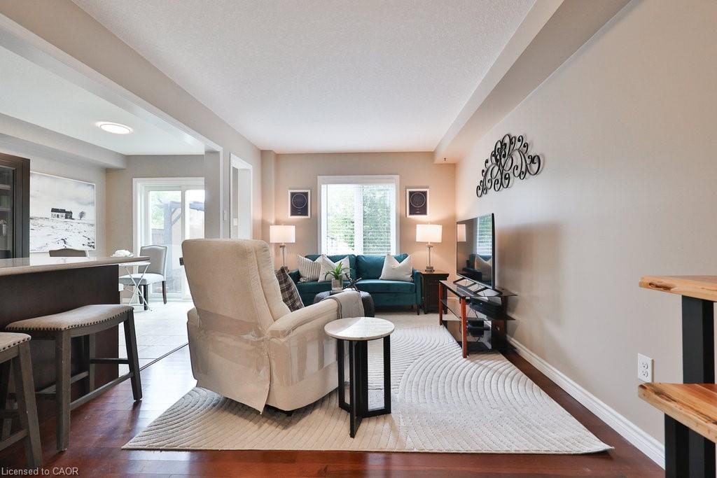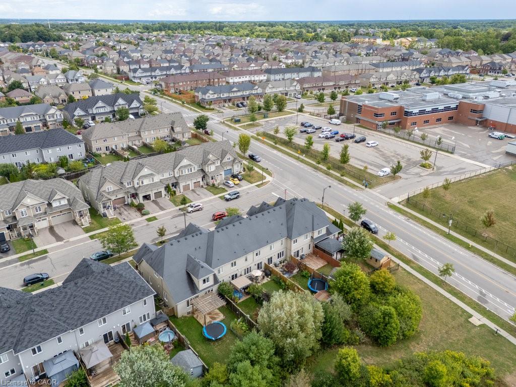 Welcome home. FREEHOLD – Beautifully maintained 3-bedroom, 3-bath townhouse offering 1,495 sq. ft. in the family-friendly West Brant community. Ideally situated close to schools, shopping, walking trails & parks. Premium lot backing onto a pond with no rear neighbours! Move-in ready home features a single-car garage with inside entry, custom new front door, hardwood flooring on the main level and 9’ ceilings. The open-concept living/dining area flows into an eat-in kitchen with updated stainless steel appliances, and a centre island for additional prep space. Newer sliding doors lead to a fully fenced backyard oasis, perfect for extending your living space outdoors. A gardener’s delight that feels like country living within the city. Upstairs you’ll find newer vinyl flooring, a spacious primary suite with walk-in closet and ensuite with an oversized shower, 2 additional bedrooms, a bright home office nook and a 4-pc bathroom. Stylish finishes, bright open layout, and a premium pond lot with a backyard oasis…this one won’t disappoint!