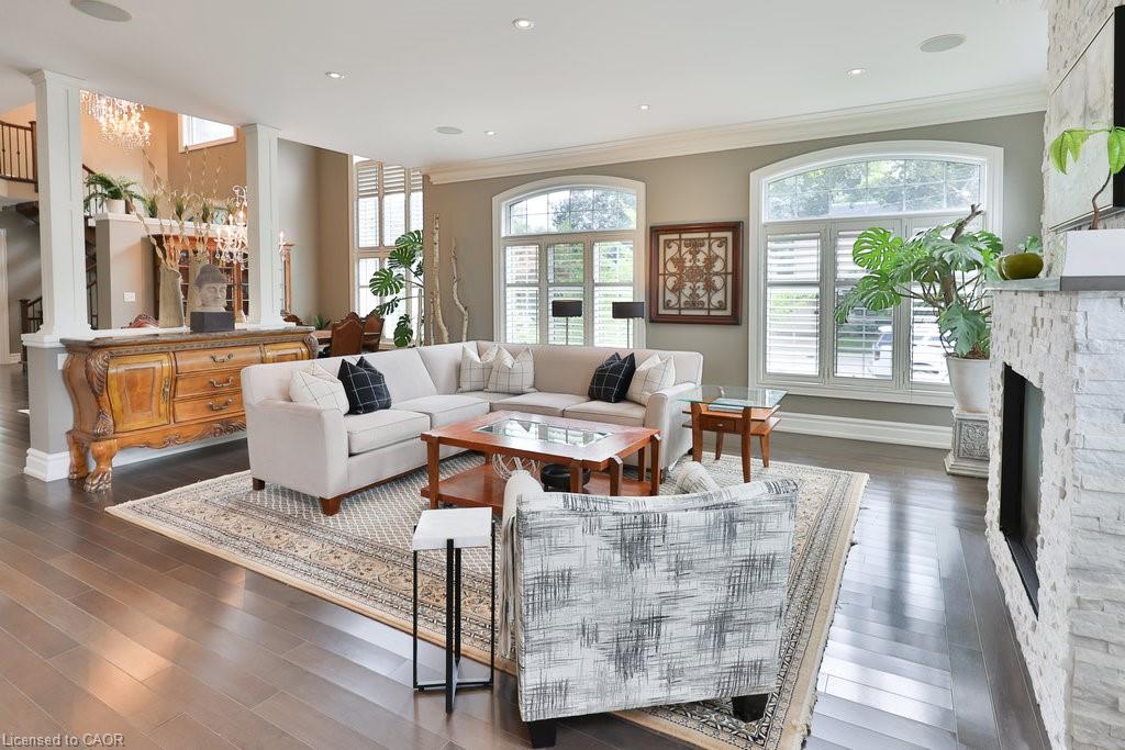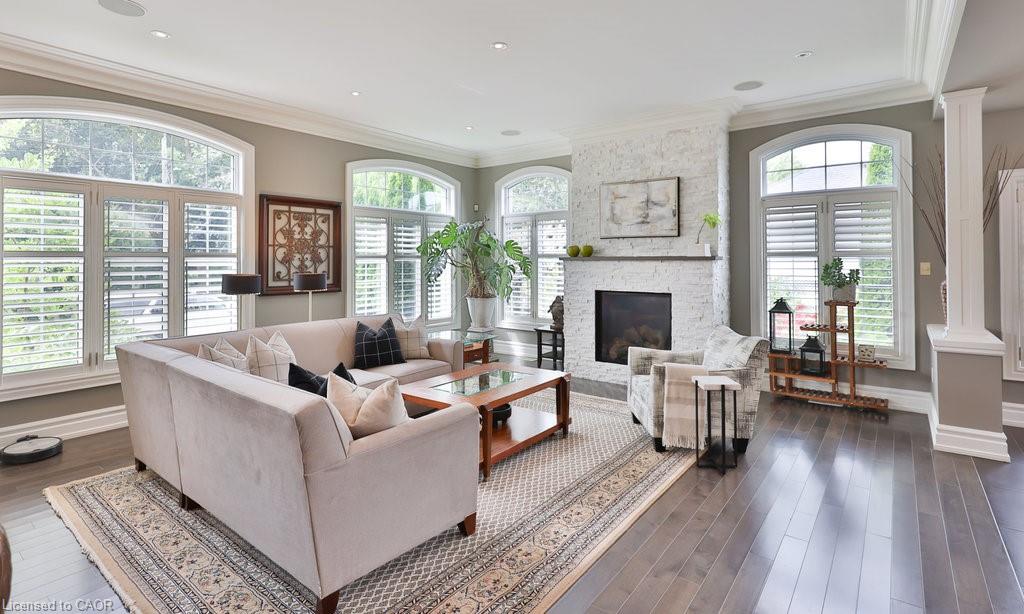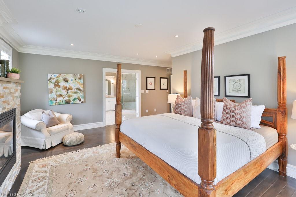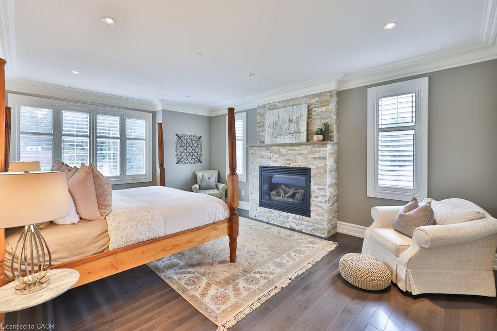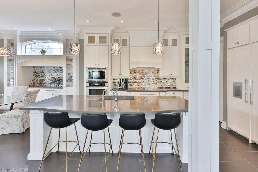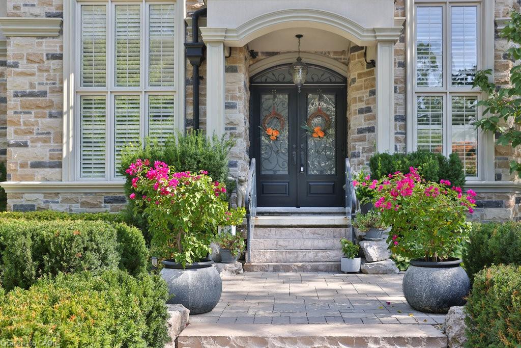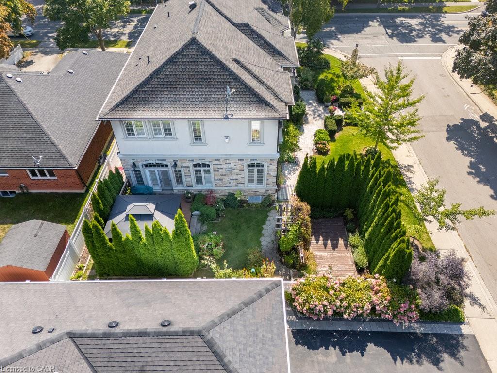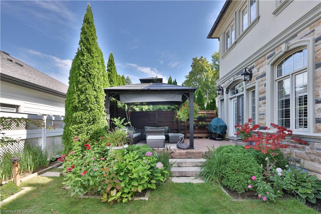 Welcome home. Prestigious Lakeshore address, just steps from the water’s edge and a short stroll to Burlington’s vibrant downtown core. This custom-built residence showcases timeless elegance and exceptional curb appeal, framed by lush, landscaped gardens. Inside, a grand foyer with soaring ceilings and walls of windows flood the home with natural light, introducing airy and sophisticated interiors. At its heart lies a designer kitchen—an entertainer’s dream, featuring a sprawling island with bar seating, quartz countertops, a full wall of refrigeration, premium Thermador appliances (including two dishwashers), abundant storage, and seamless flow into the sunlit dining area. The open-concept layout continues into the expansive great room, anchored by a striking stone fireplace, and transitions effortlessly into the formal dining area. A private office/den, elegant powder room, custom mudroom, and interior access to the oversized double garage complete the main level. Upstairs, the luxurious primary suite offers a cozy fireplace, spa-inspired five-piece ensuite, and spacious walk-in closet. Three additional bedrooms, each with ensuite or semi-ensuite access, provide comfort and privacy, while a convenient laundry room completes this level. Step outside to your private backyard oasis, surrounded by mature, colorful gardens. Two patios, including one with a large pergola, create the perfect setting for relaxation or outdoor entertaining. The lower level presents endless possibilities with soaring ceilings, an expansive open layout, rough-ins for kitchen and bathroom, heated floor hookups, generous storage, and a separate enclosed room ideal for an additional bedroom or flexible living space. Luxury Certified.