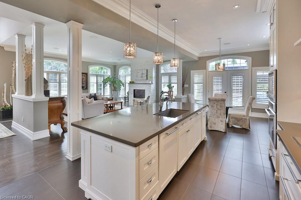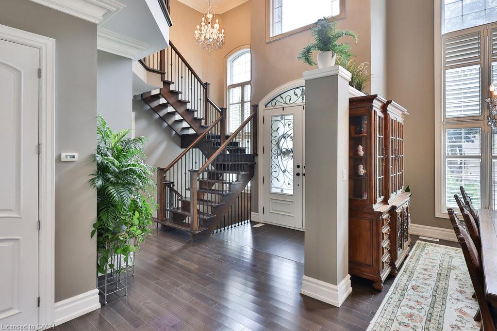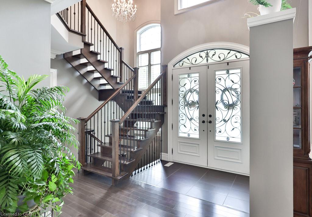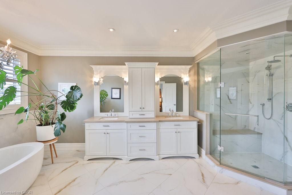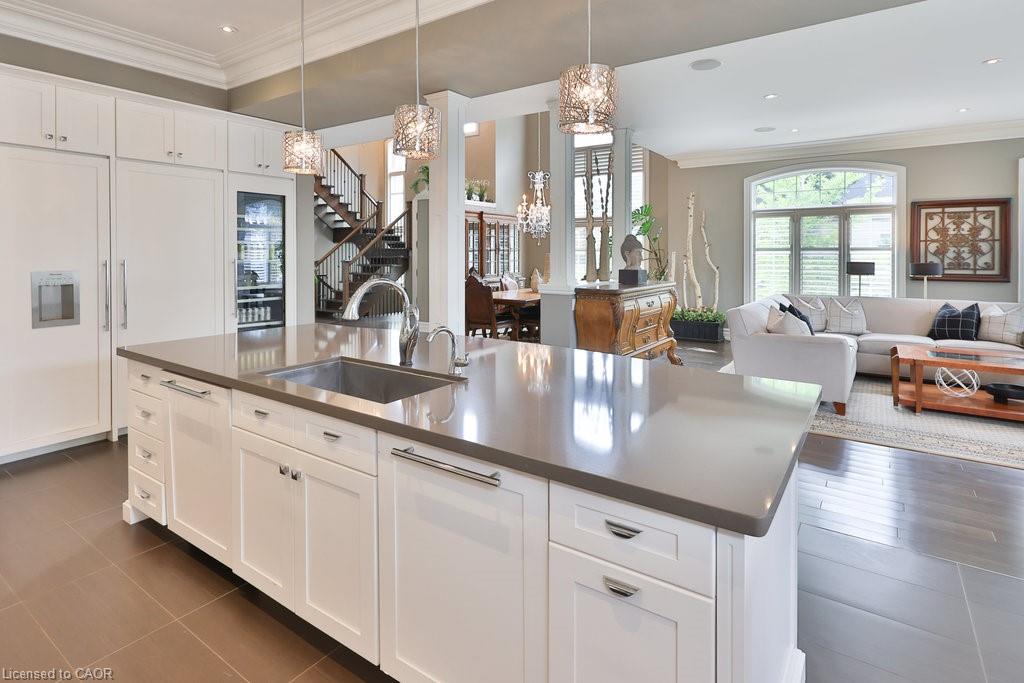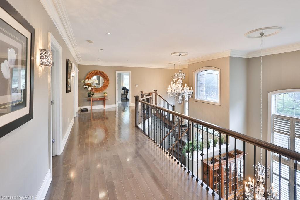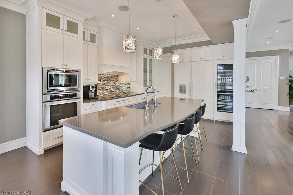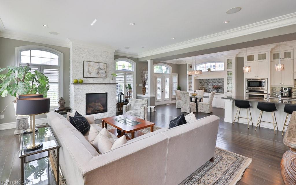 Welcome home. Prestigious Lakeshore address, just steps from the water’s edge and a short stroll to Burlington’s vibrant downtown core. This custom-built residence showcases timeless elegance and exceptional curb appeal, framed by lush, landscaped gardens. Inside, a grand foyer with soaring ceilings and walls of windows flood the home with natural light, introducing airy and sophisticated interiors. At its heart lies a designer kitchen—an entertainer’s dream, featuring a sprawling island with bar seating, quartz countertops, a full wall of refrigeration, premium Thermador appliances (including two dishwashers), abundant storage, and seamless flow into the sunlit dining area. The open-concept layout continues into the expansive great room, anchored by a striking stone fireplace, and transitions effortlessly into the formal dining area. A private office/den, elegant powder room, custom mudroom, and interior access to the oversized double garage complete the main level. Upstairs, the luxurious primary suite offers a cozy fireplace, spa-inspired five-piece ensuite, and spacious walk-in closet. Three additional bedrooms, each with ensuite or semi-ensuite access, provide comfort and privacy, while a convenient laundry room completes this level. Step outside to your private backyard oasis, surrounded by mature, colorful gardens. Two patios, including one with a large pergola, create the perfect setting for relaxation or outdoor entertaining. The lower level presents endless possibilities with soaring ceilings, an expansive open layout, rough-ins for kitchen and bathroom, heated floor hookups, generous storage, and a separate enclosed room ideal for an additional bedroom or flexible living space. Luxury Certified.
