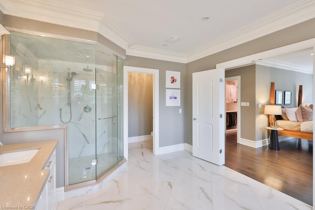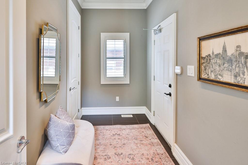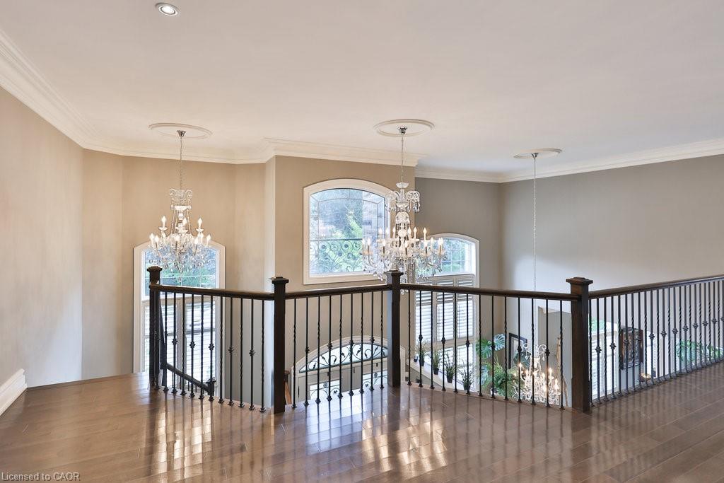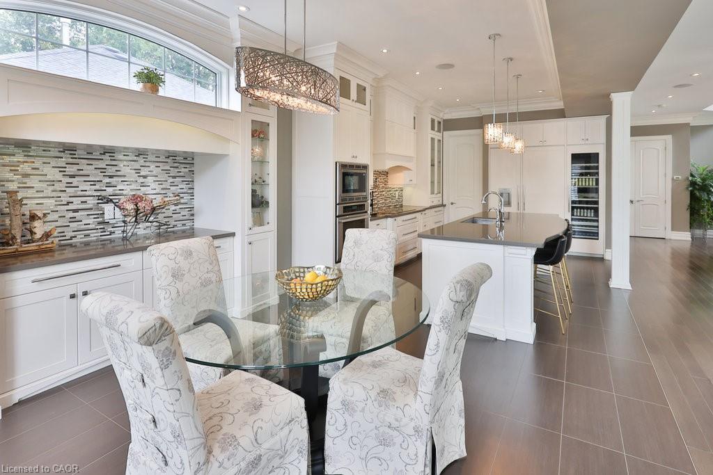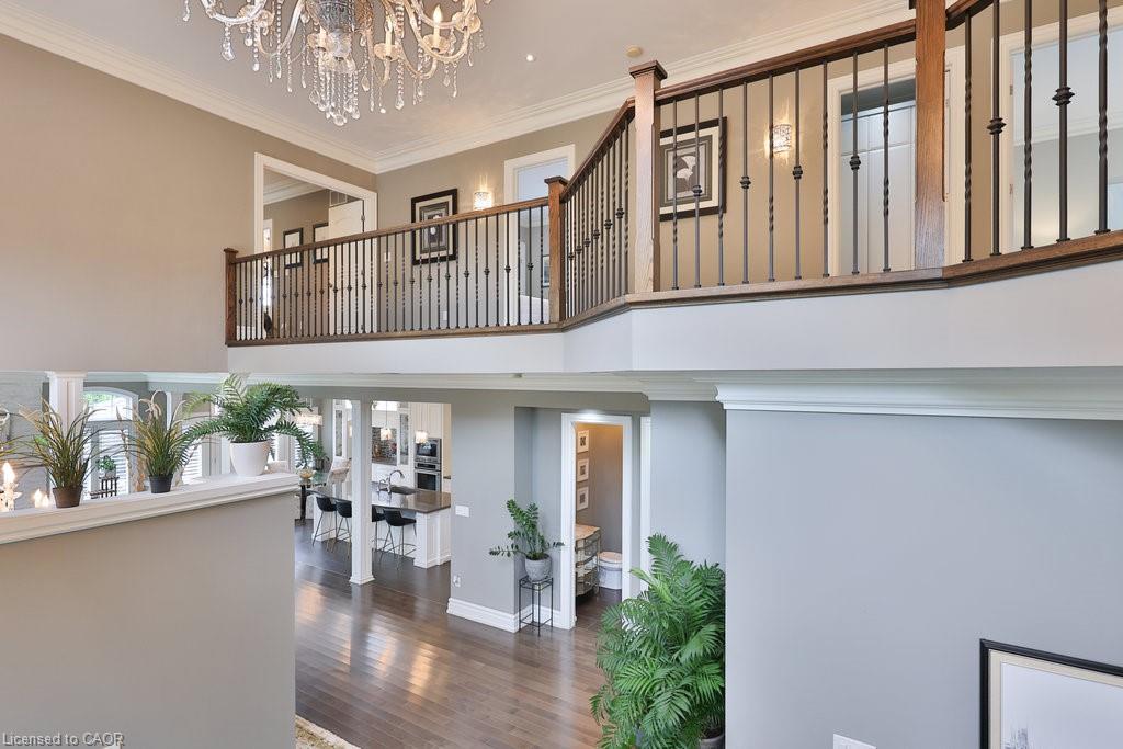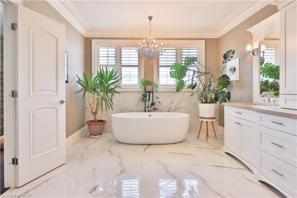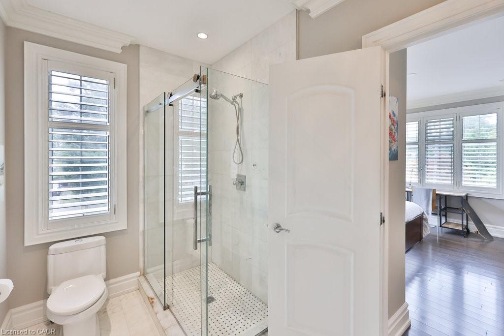 Welcome home. Prestigious Lakeshore address, just steps from the water’s edge and a short stroll to Burlington’s vibrant downtown core. This custom-built residence showcases timeless elegance and exceptional curb appeal, framed by lush, landscaped gardens. Inside, a grand foyer with soaring ceilings and walls of windows flood the home with natural light, introducing airy and sophisticated interiors. At its heart lies a designer kitchen—an entertainer’s dream, featuring a sprawling island with bar seating, quartz countertops, a full wall of refrigeration, premium Thermador appliances (including two dishwashers), abundant storage, and seamless flow into the sunlit dining area. The open-concept layout continues into the expansive great room, anchored by a striking stone fireplace, and transitions effortlessly into the formal dining area. A private office/den, elegant powder room, custom mudroom, and interior access to the oversized double garage complete the main level. Upstairs, the luxurious primary suite offers a cozy fireplace, spa-inspired five-piece ensuite, and spacious walk-in closet. Three additional bedrooms, each with ensuite or semi-ensuite access, provide comfort and privacy, while a convenient laundry room completes this level. Step outside to your private backyard oasis, surrounded by mature, colorful gardens. Two patios, including one with a large pergola, create the perfect setting for relaxation or outdoor entertaining. The lower level presents endless possibilities with soaring ceilings, an expansive open layout, rough-ins for kitchen and bathroom, heated floor hookups, generous storage, and a separate enclosed room ideal for an additional bedroom or flexible living space. Luxury Certified.
