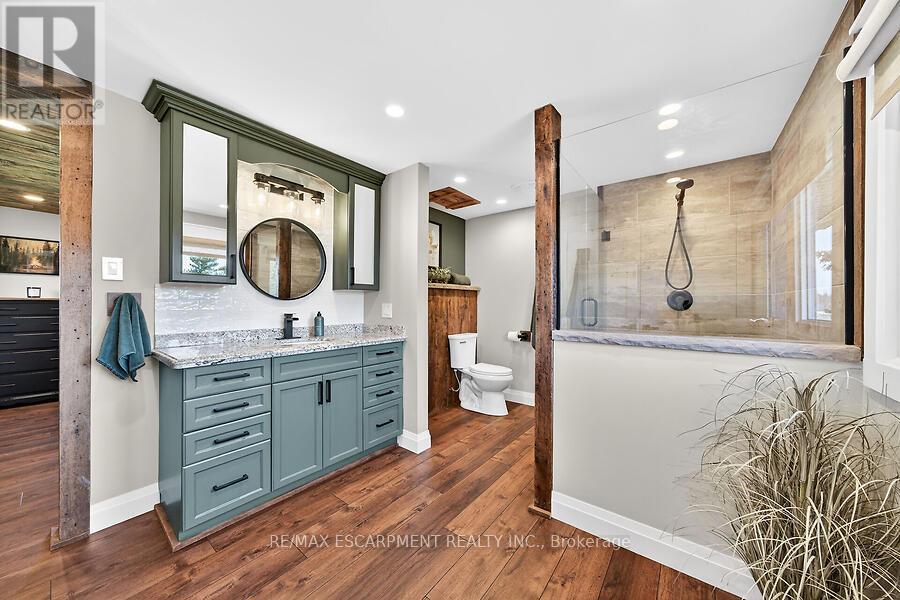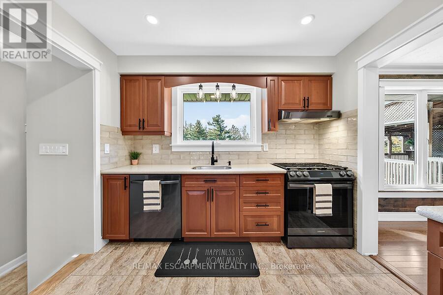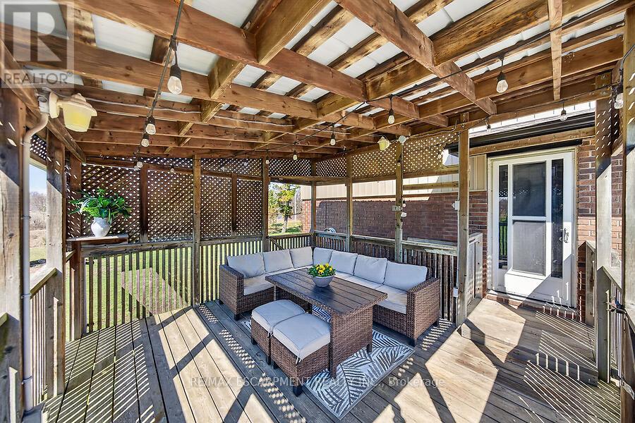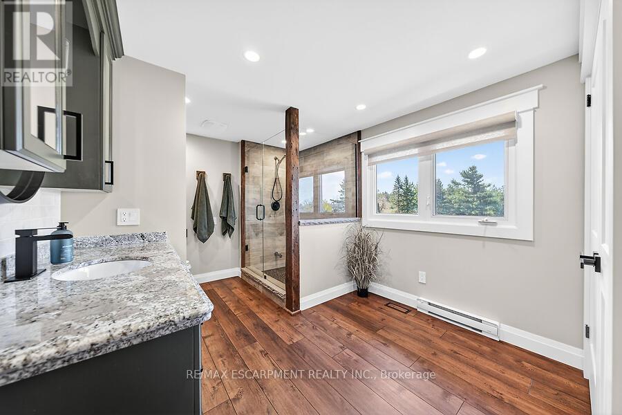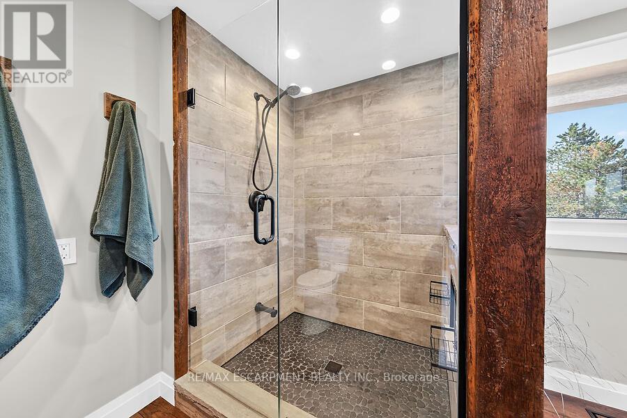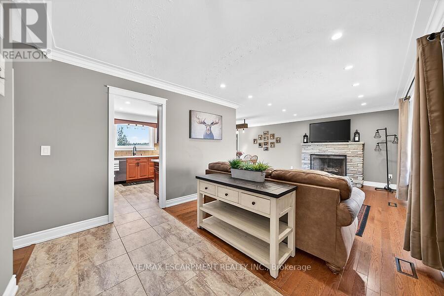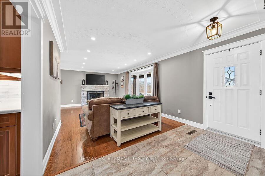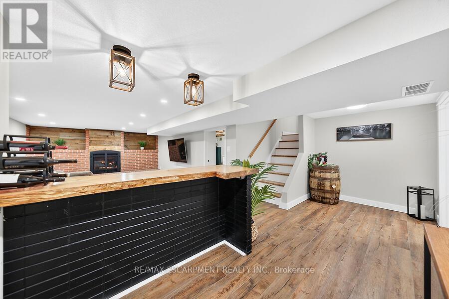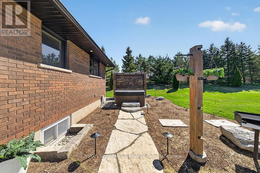 Welcome to this country 4+1, 2 full bath home with natural gas heating, set on a private lot in West Lincoln. The main floor features an L-shaped living and dining room with hardwood floors and a bay window overlooking the expansive front porch. The upgraded kitchen offers custom cabinetry and access to the backyard patio, hot tub, and lower level. There are 3 main floor bedrooms and a beautifully renovated custom bathroom. Off the dining room, the upper-level primary retreat offers a separate entrance, electric fireplace, reclaimed wood accents, and an upgraded ensuite with walk-in shower. The recently renovated lower level includes soundproofing, new flooring, a spacious open-concept family room with wall-to-wall brick and natural gas fireplace insert, bar area with live-edge finishes, an additional bedroom with walk-up access to the attached garage, plus storage and utility rooms. The south-facing outdoor space is perfect for relaxing and enjoying sunset spritzes. Bonus features include reclaimed wood and natural stone finishes, extensive pot lighting, forced air natural gas heating, and generator. (id:52316)