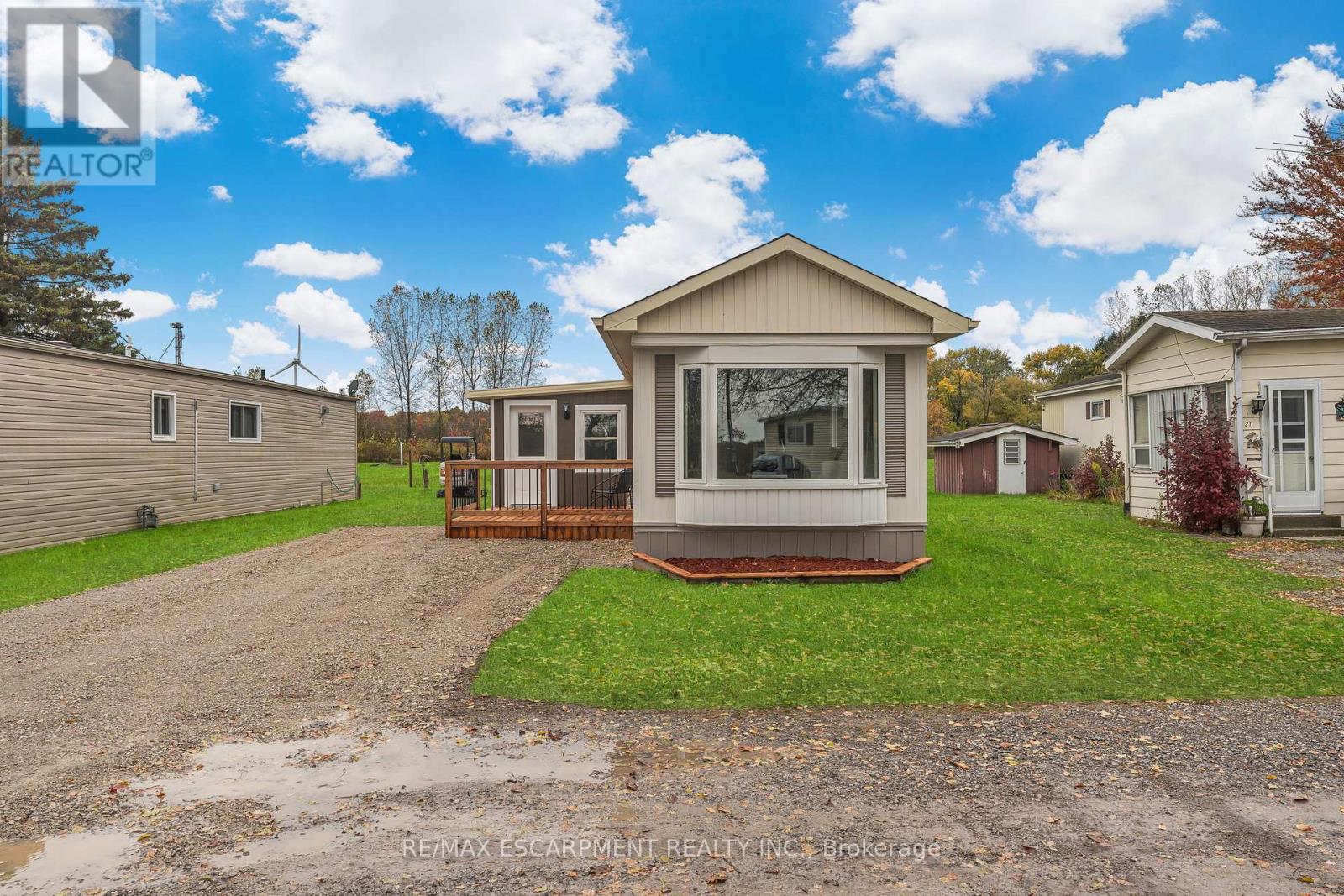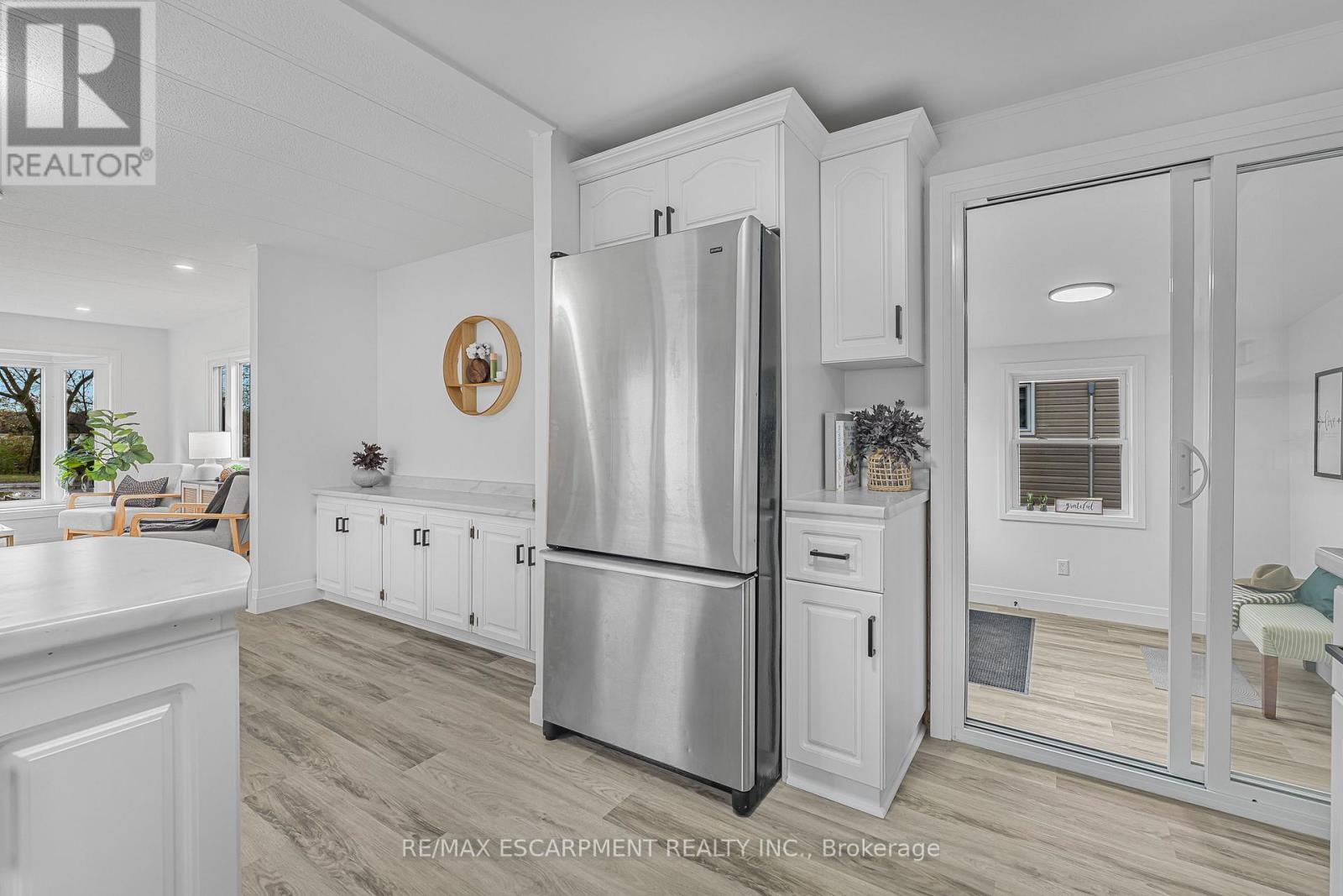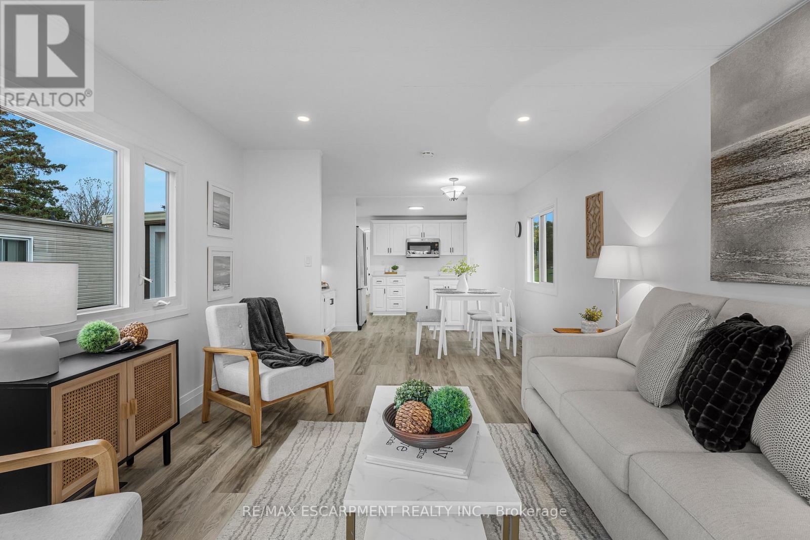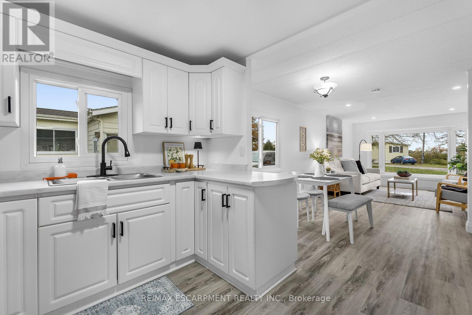 Welcome to Ellsworth Acres Mobile Home Community in Wainfleet! This beautifully updated mobile home has been extensively renovated and is move-in ready. The spacious, modern kitchen boasts stainless steel appliances, stylish flooring, new drywall with vapor barrier, and sleek pot lighting. The open-concept kitchen, living, and dining area is bright and inviting, featuring large vinyl/thermal windows and a charming coffee bar. The home includes two bedrooms plus a generous office-perfect for hosting guests or working from home. The fully updated bathroom features a brand-new walk-in shower, ideal for those with mobility needs. Additional improvements include new PEX water lines, doors, trim, and a brand-new deck for outdoor enjoyment. With parking for two vehicles and a 10' x 10' storage shed, this move-in-ready home checks all the boxes. Monthly fees cover land lease, property taxes, garbage and snow removal, water, and septic services. Ideally situated just a short drive from Dunnville, Welland, and Smithville, this home offers the perfect blend of modern comfort and small-town charm. Note: some photos have been virtually staged. (id:52316)